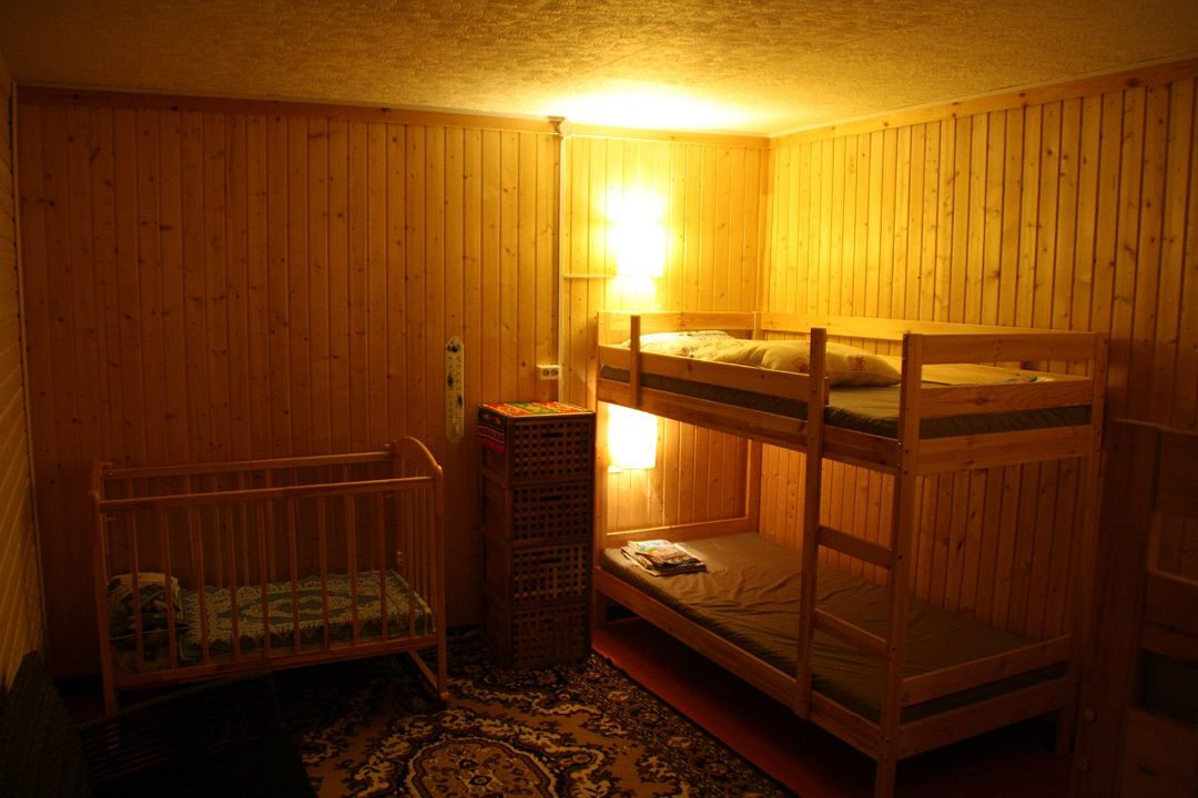 В гостевом доме (2 комнаты, кухня, гостиная) 10 спальных мест: 3 двухъярусные кровати, двуспальная тахта, раздвижной двухместный диван.