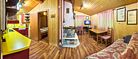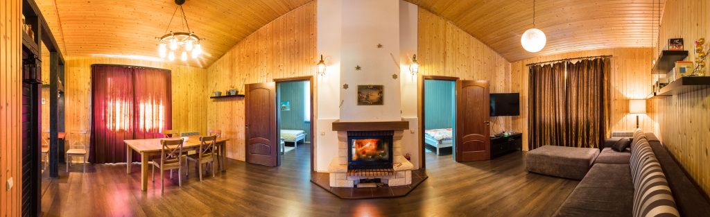 Оснащен новой современной мебелью, сантехникой, аудио-видео и бытовой техникой, спутниковым ТВ. В гостиной находится камин. Отопление: теплый пол, электроконвекторы. Есть все удобства (горячая и холодная вода, канализация).