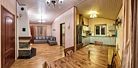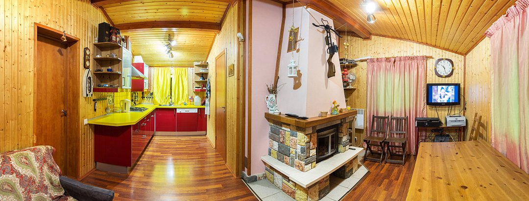 Кухня-гостиная 20 м2: камин, диван, стол и стулья, ЖК ТВ, спутниковое ТВ, газовая плита, вытяжка, мойка, посудомоечная машина, кухонная мебель, посуда, шампуры и т.д.
