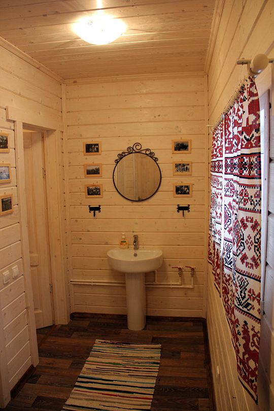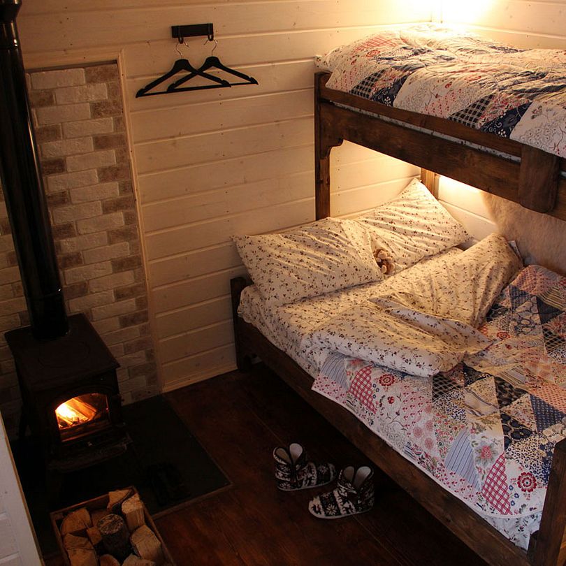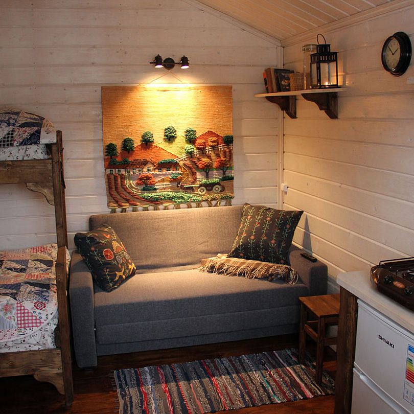 Внутри домики обставлены экологичной мебелью и оборудованы всеми теми предметами и техникой, которые помогают создать комфорт и дополнить ощущение того, что Вы находитесь дома, а именно: спутниковое ТВ, уютная печка-камин, электрический чайник, холодильник, включая морозильную камеру, плита (газовая), посуда для сервировки и приготовления любимых Вами блюд, а также постельные комплекты, тапочки и полотенца для каждого нашего гостя. Туалеты и современные душевые находятся вне домиков, они расположены в здании по соседству, всего в двух шагах от Вашего размещения. А на личной террасе у каждого домика установлен собственный мангал.