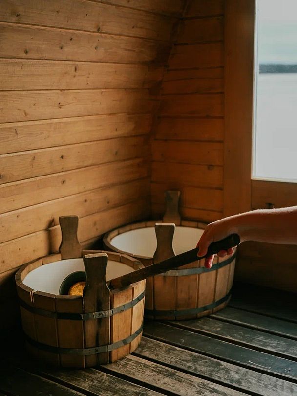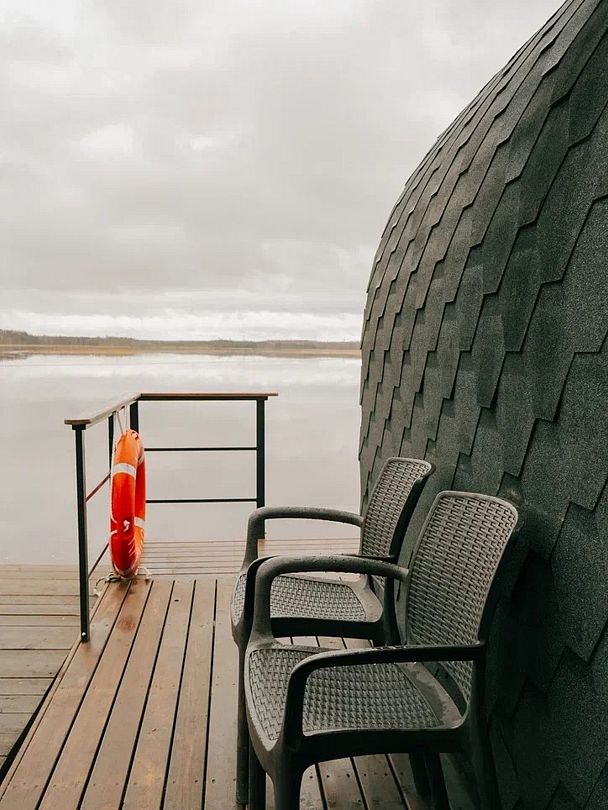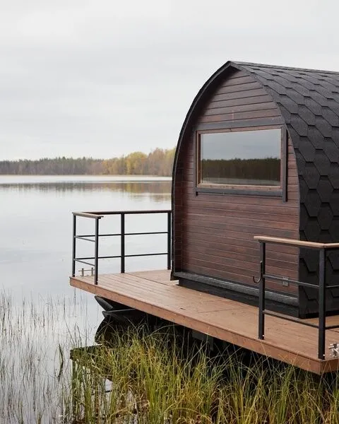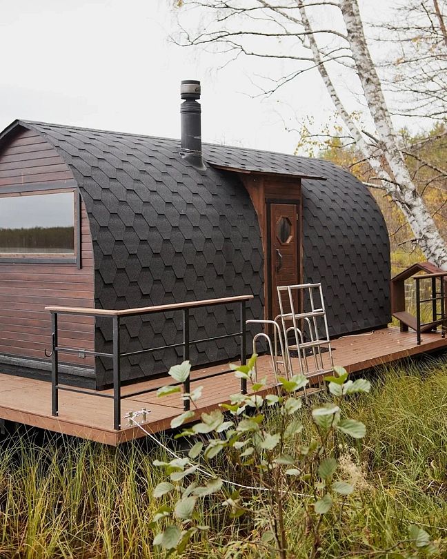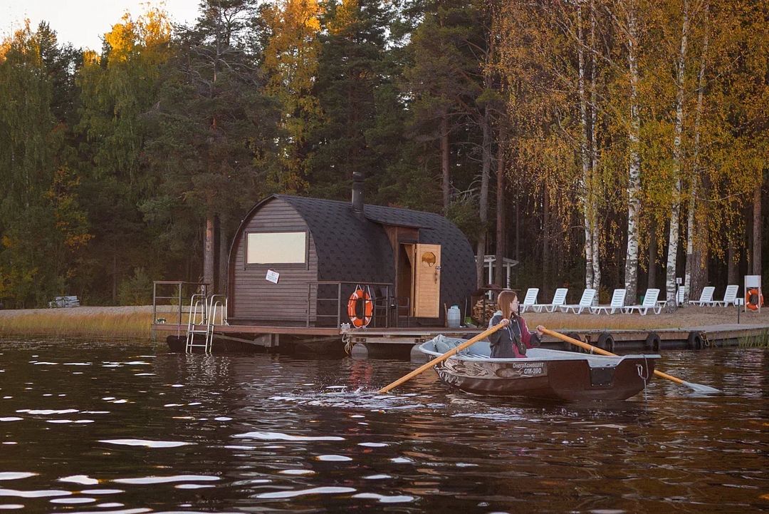 С мая по октябрь на берегу озера Навдозеро действует плавучая баня, построенная из древесины кедра на понтонном основании.