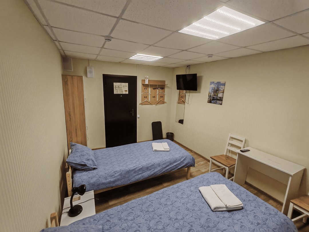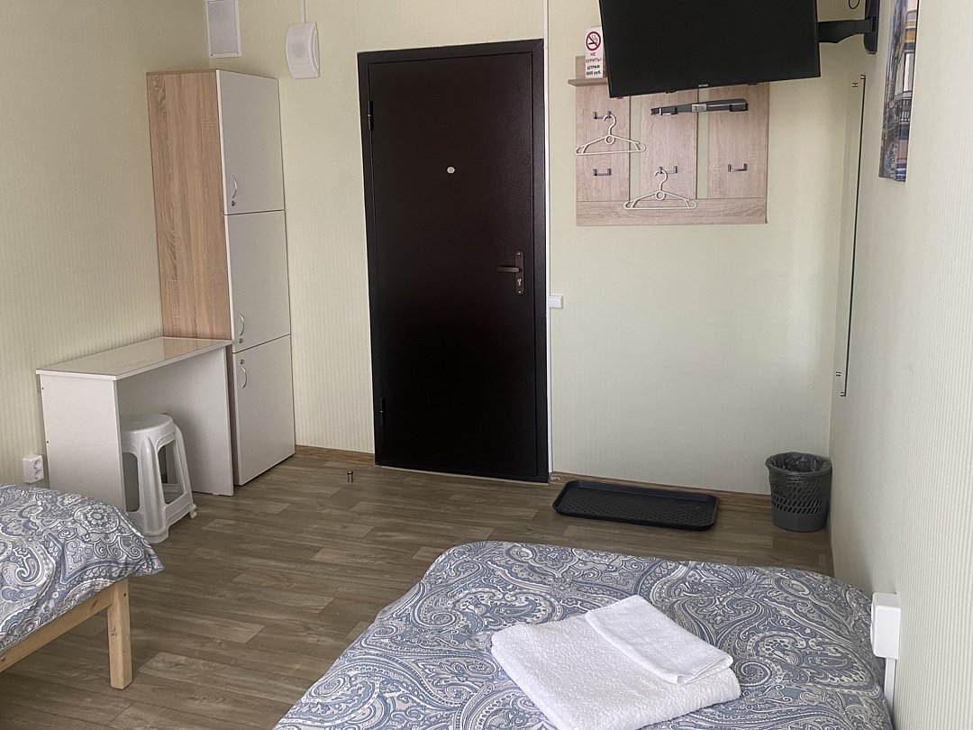 A room with two single beds, a TV, a table, a wardrobe, a clothes rack, bathrooms and showers on the floor,В номере