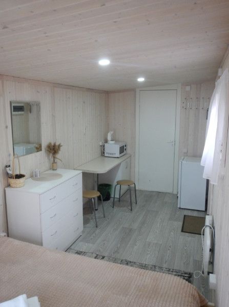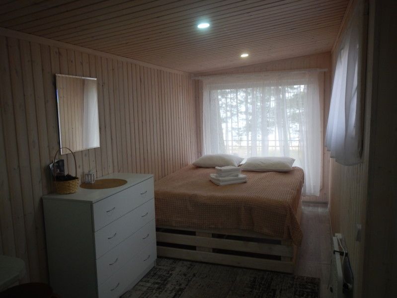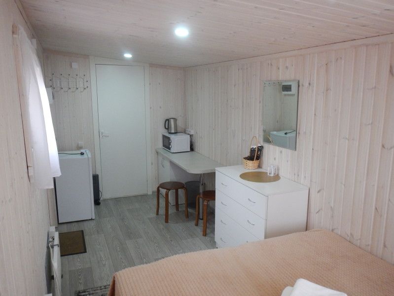 Домик для круглогодичного размещения, рассчитан на две персоны. Оборудование дополнительных мест обсуждается. В доме большая кровать, размером 200*160 с двумя эргономичными матрасами, с мягкими подушками, теплыми одеялами. Отопление электро-конвекторами. Имеется санузел с туалетом и душем, горячая вода. Мини кухня с холодильником, микроволновой печью, чайником, минимальным комплектом посуды. Домики с открытой террасой. С панорамного окна открывается шикарный вид на озеро Сямозеро.