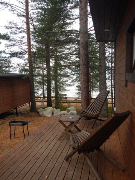Домик для круглогодичного проживания с террасой, с панорамным окном (с ролетной шторкой) и видом на озеро.