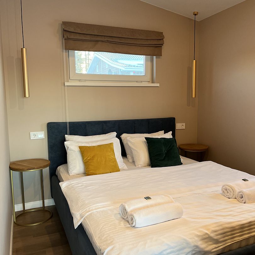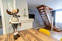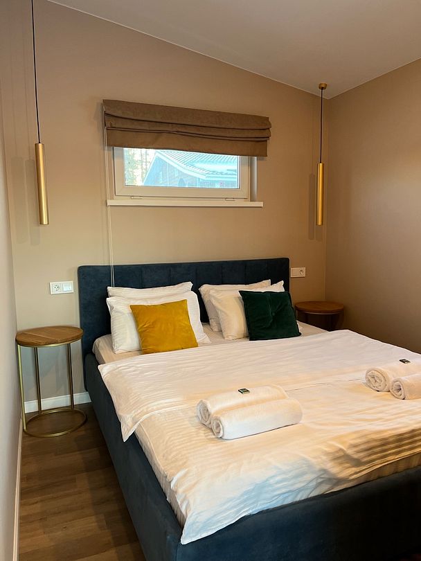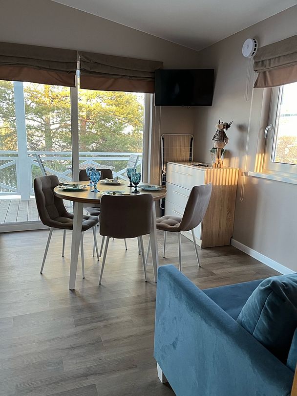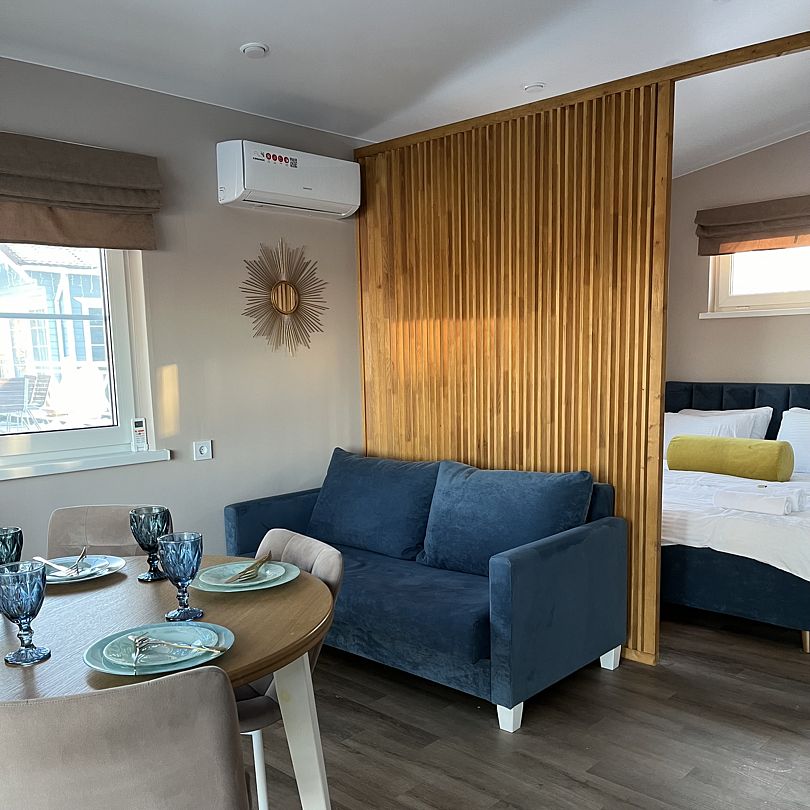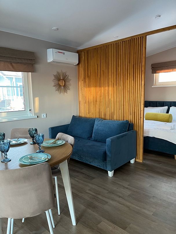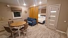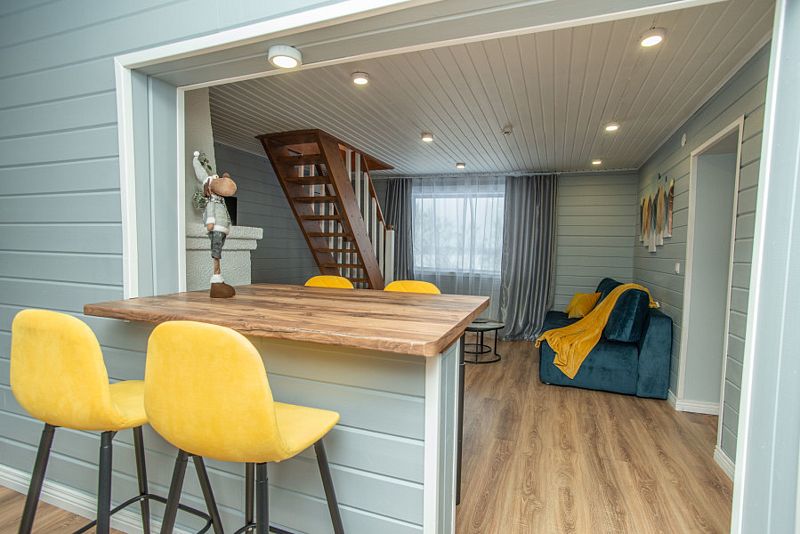 Уютный дом площадью 35 кв. м выполнен в тёплых, светлых тонах и идеально подходит для отдыха вдвоём.