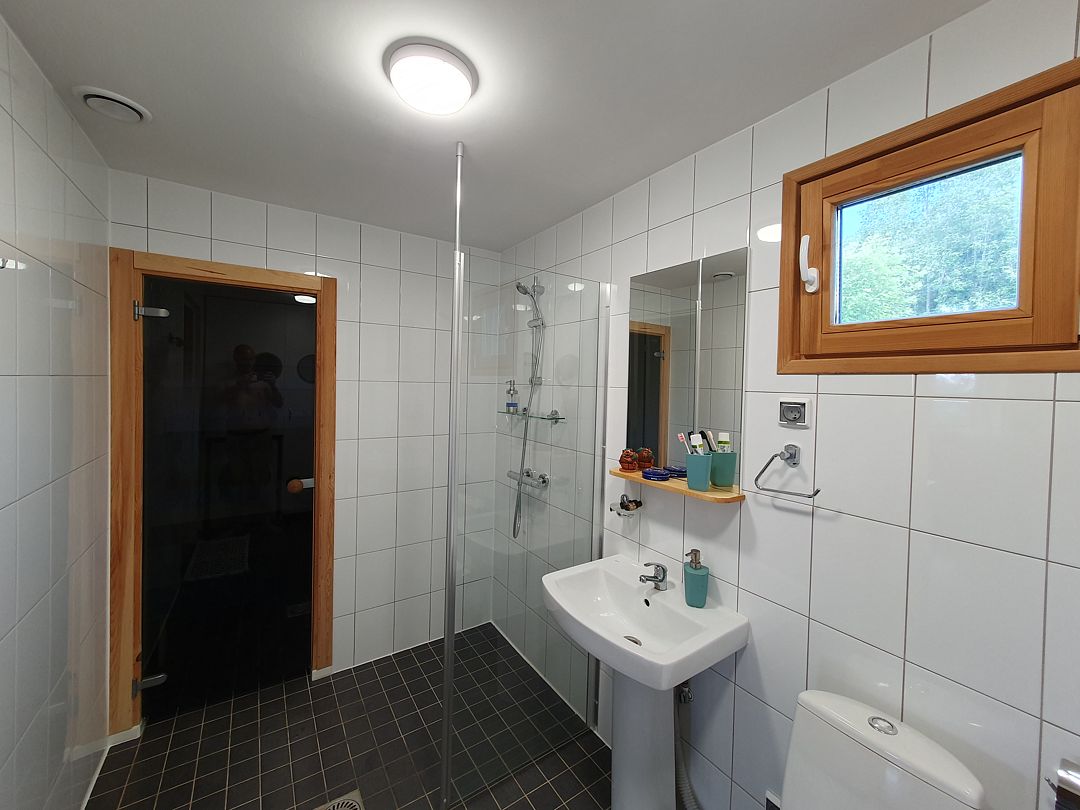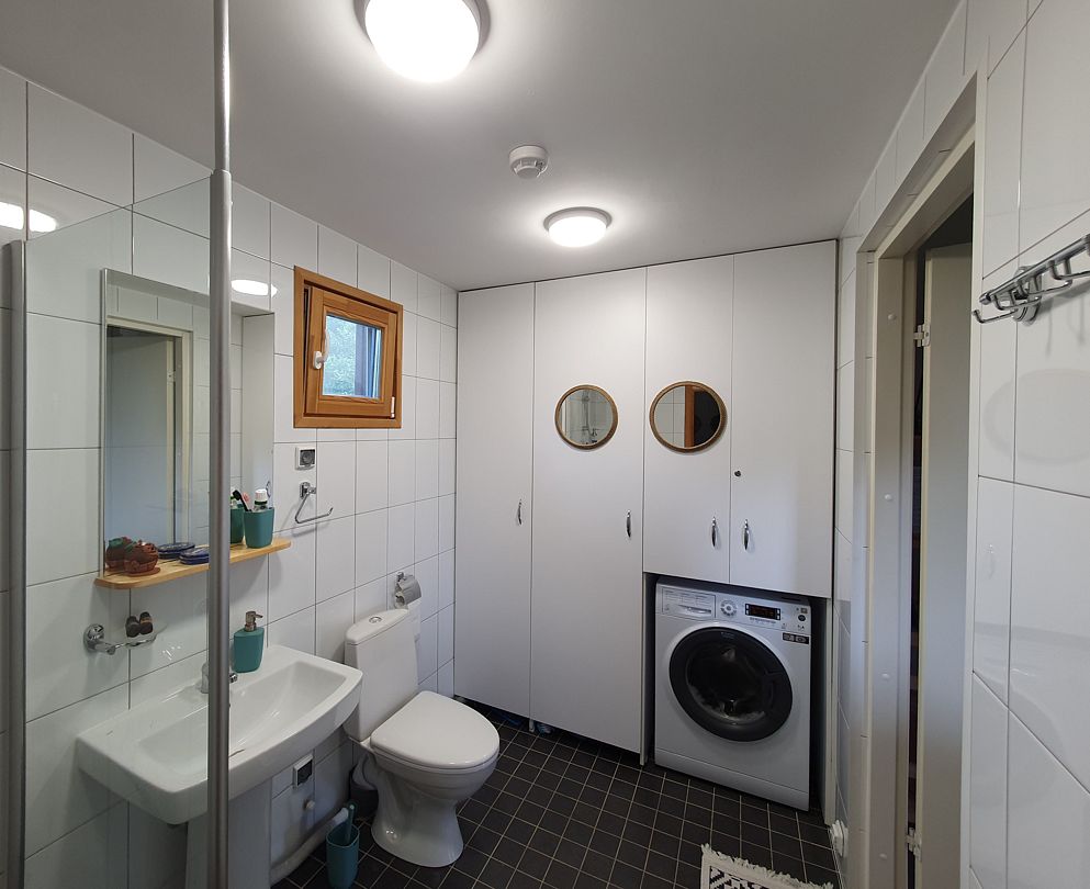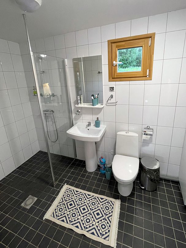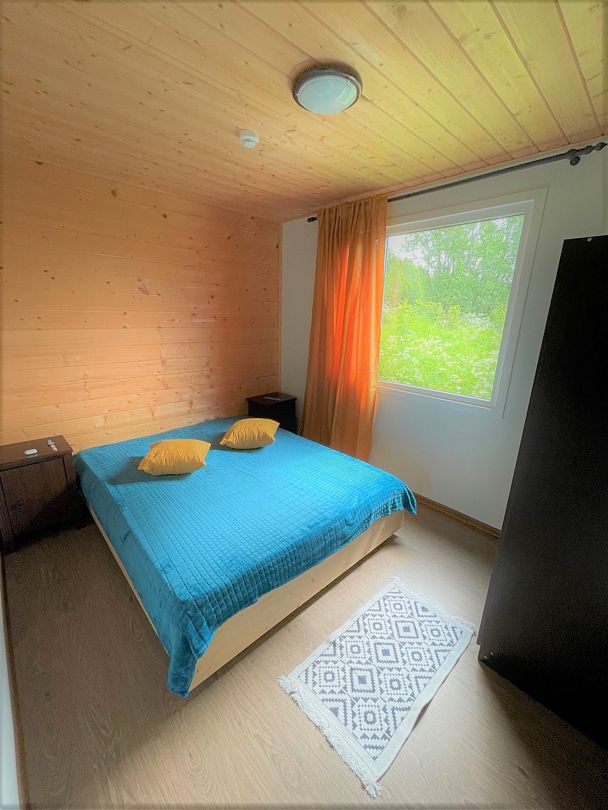 В доме две раздельные спальни, в каждой спальне по одной двуспальной кровати, и большой двуспальный диван в гостиной. В санузле душевая, теплый пол и стиральная машина. Есть Smart TV, WI-FI интернет, уверенно ловят все мобильные операторы.