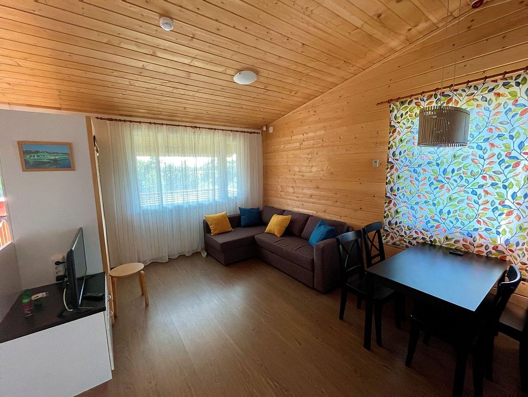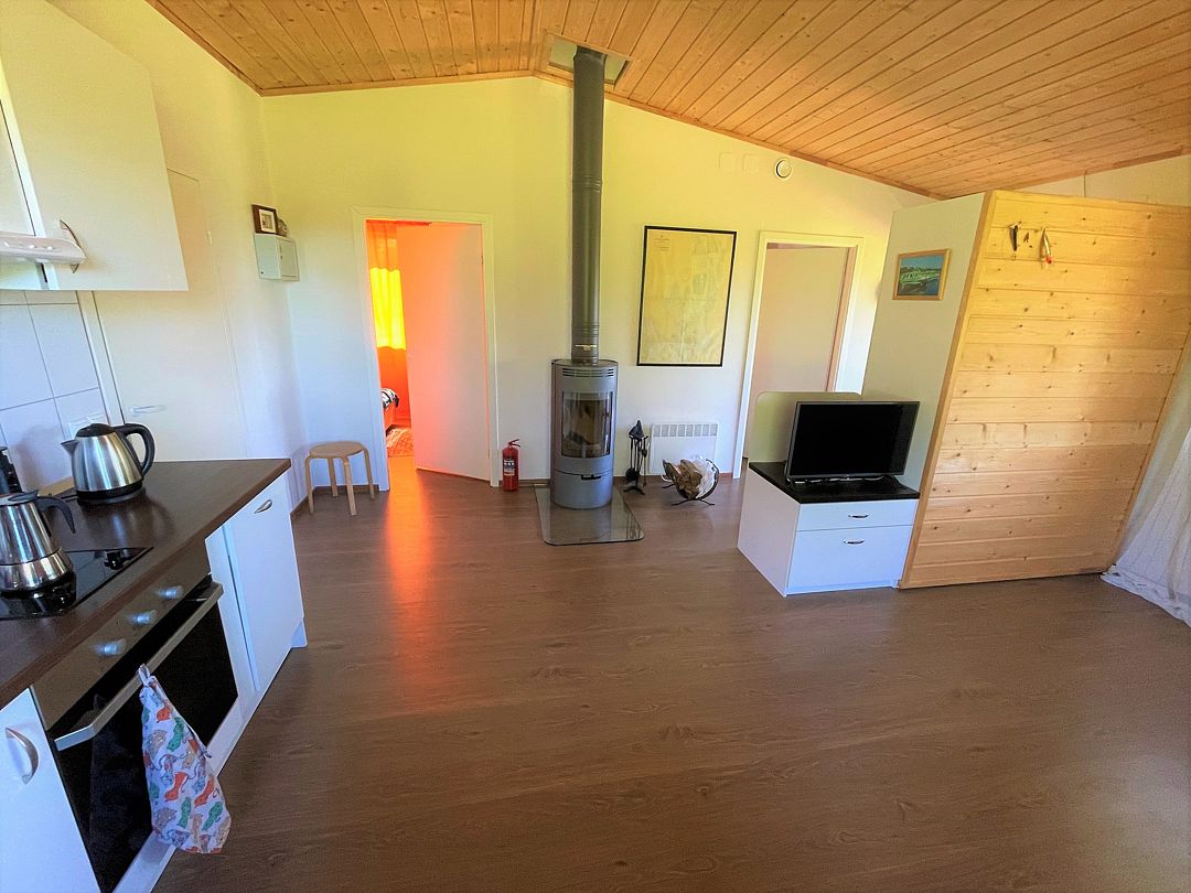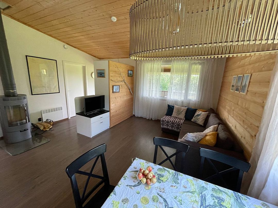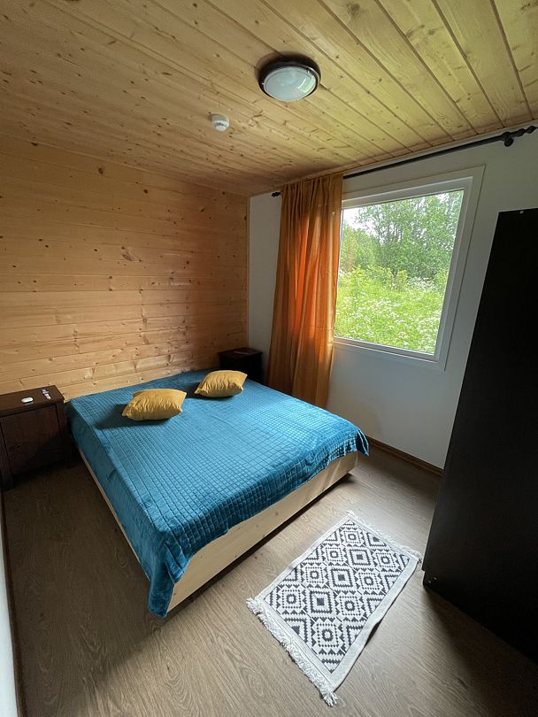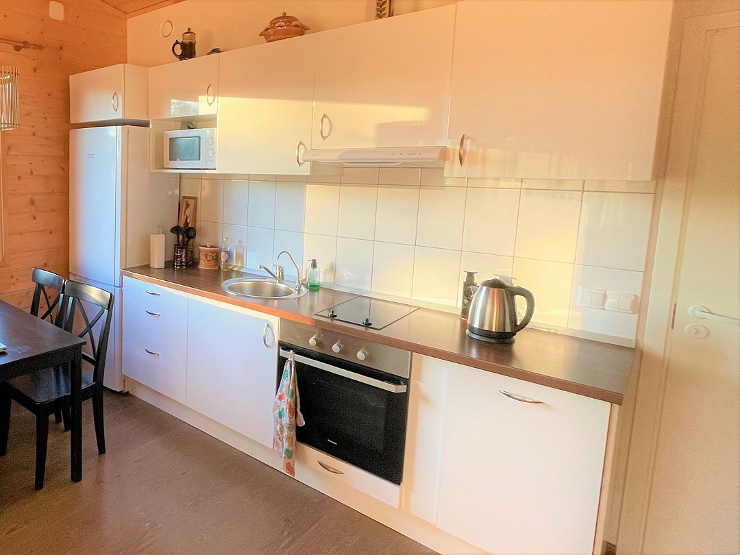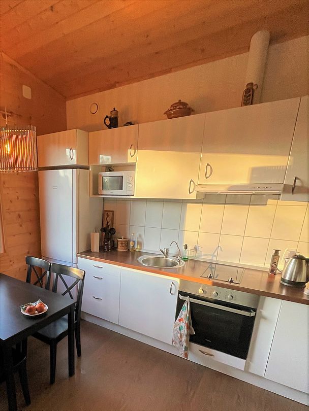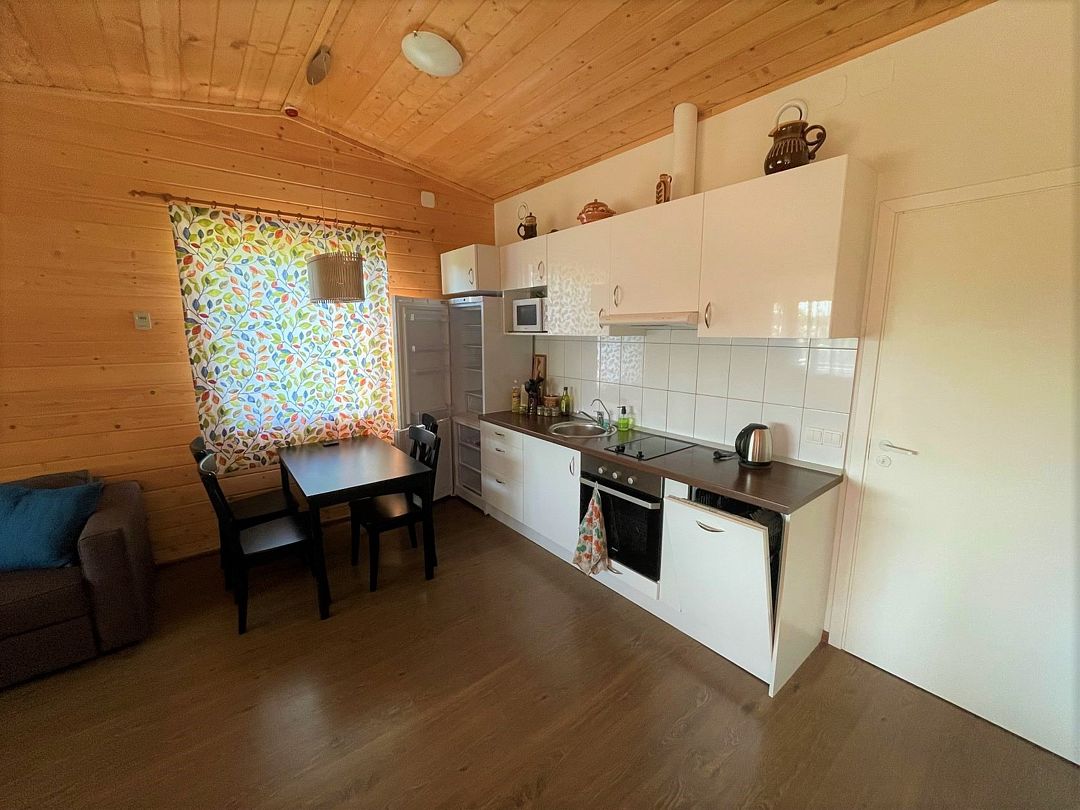 В коттедже с удобством смогут разместиться четверо взрослых человек и двое детей. Кухня полностью укомплектована всей необходимой утварью, холодильником с морозилкой, стекло-керамической электроплитой, духовым шкафом и посудомоечной машиной.