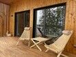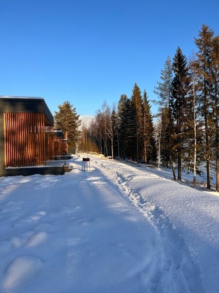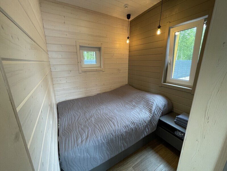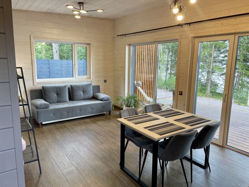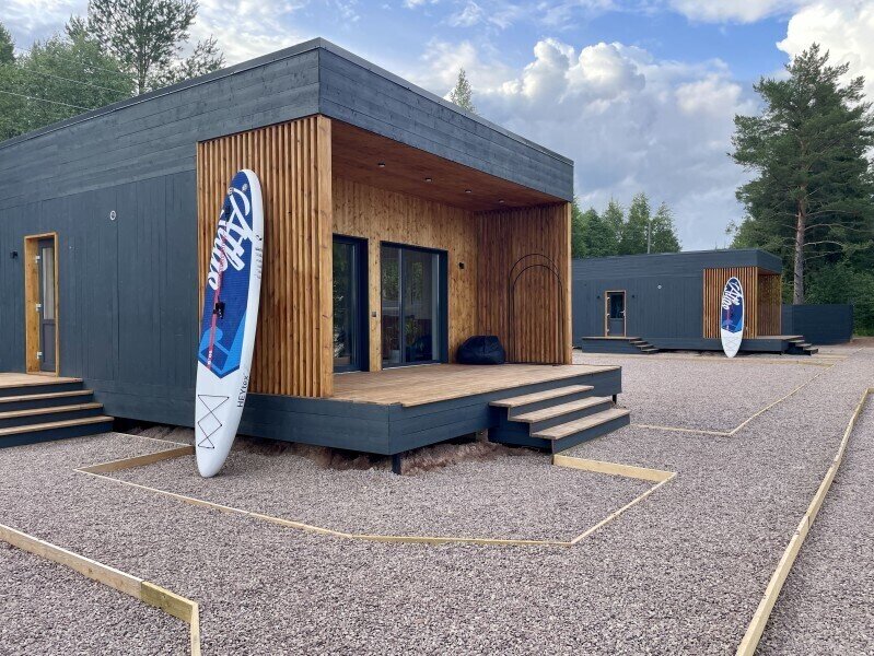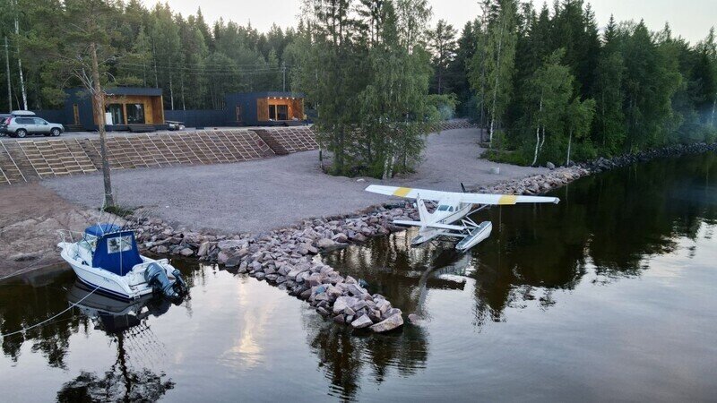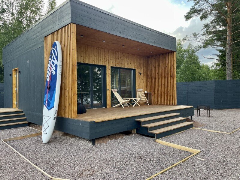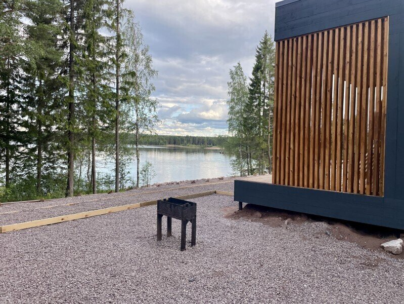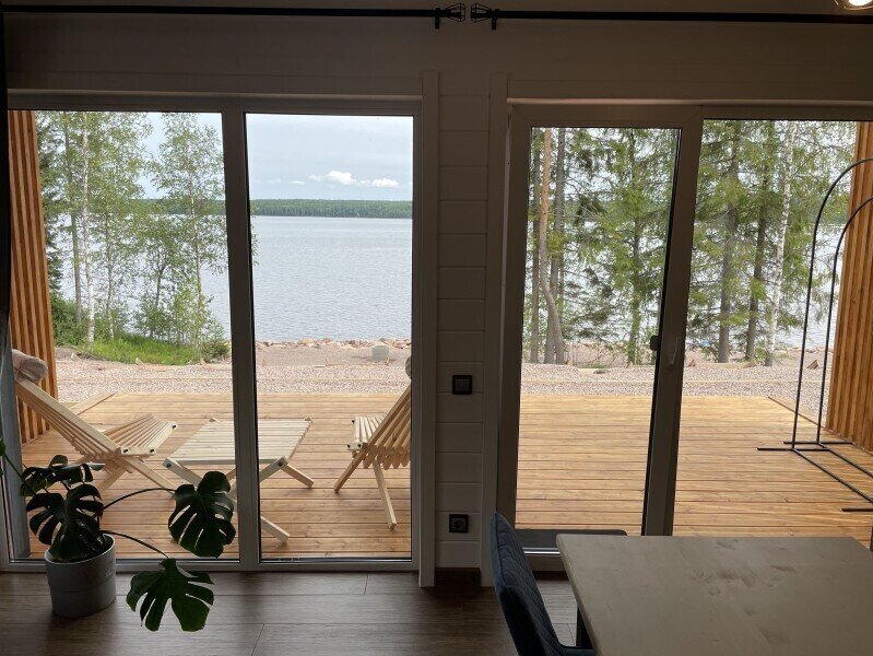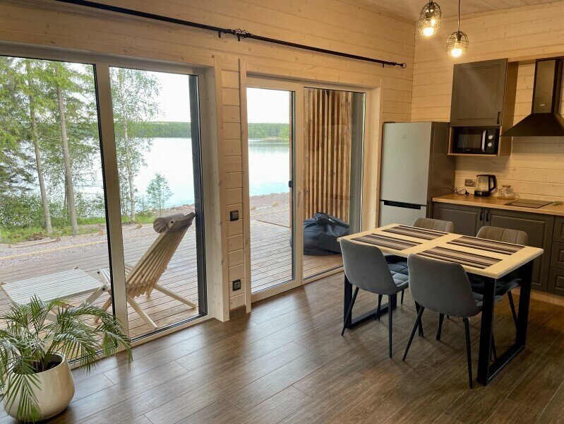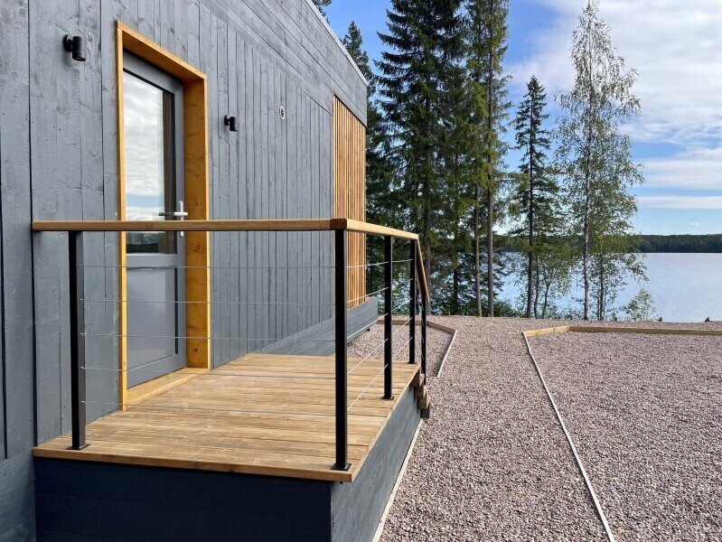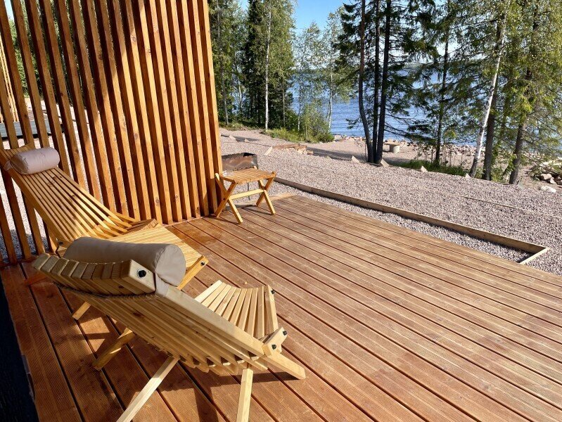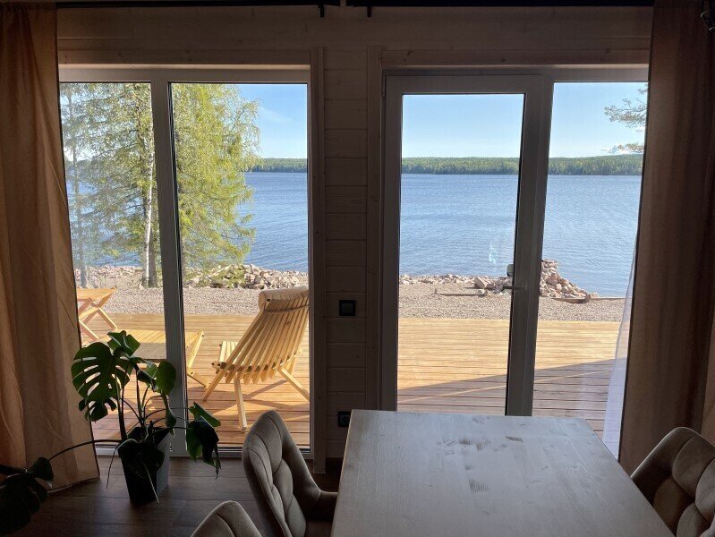 Это одноэтажные жилые дома площадью 36 квадратных метров и террасой 18 квадратных метров, предназначенные для круглогодичного проживания. Из панорамных окон открывается завораживающий вид на Онежское озеро и лес на его берегу. Внутри расположена просторная кухня-гостиная с обеденным столом и зоной отдыха, спальня, ванная комната с сауной, прихожая, а также терраса под кровлей с освещением.