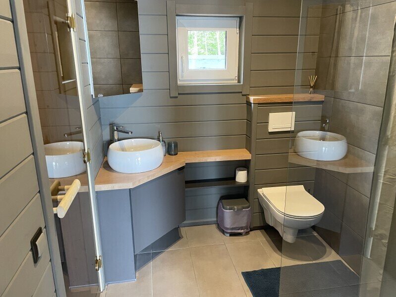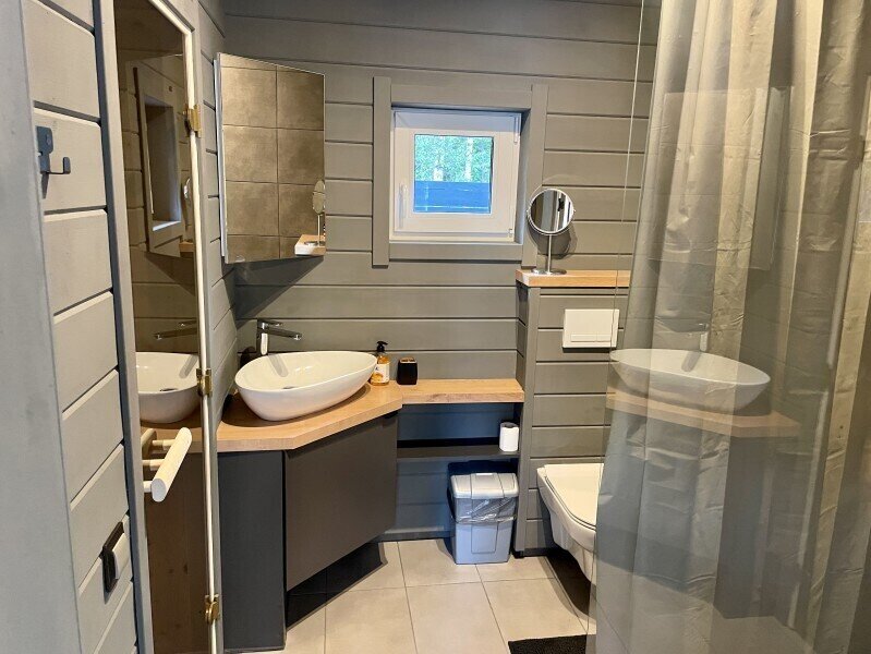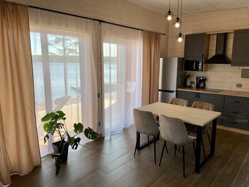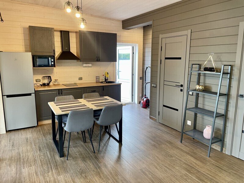 Планировка дома: просторная кухня-гостиная с обеденным столом и зоной отдыха, спальня, ванная комната с сауной, прихожая, терраса под кровлей с освещением и уличной мебелью. Бытовая техника и посуда: холодильник, микроволновая печь, варочная поверхность, чайник, кофеварка капельного типа, вытяжка, беспроводная колонка, приборы освещения. В доме имеется набор посуды и столовых приборов на 4-5 персон, разделочные ножи, две кастрюли, сковородка, бокалы под вино и шампанское и другие кухонные аксессуары для готовки. Для приготовления пищи на улице предусмотрен мангал, решетка и набор шампуров.