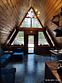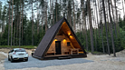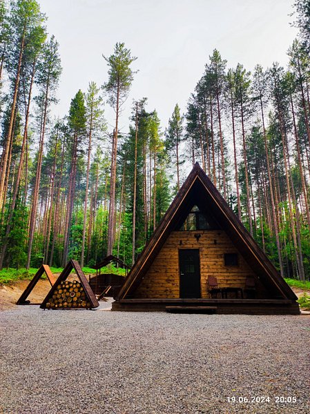 Новый современный деревянный зко-дом в стиле A-Frame в сосновом лесу на берегу озера Плотничье.
