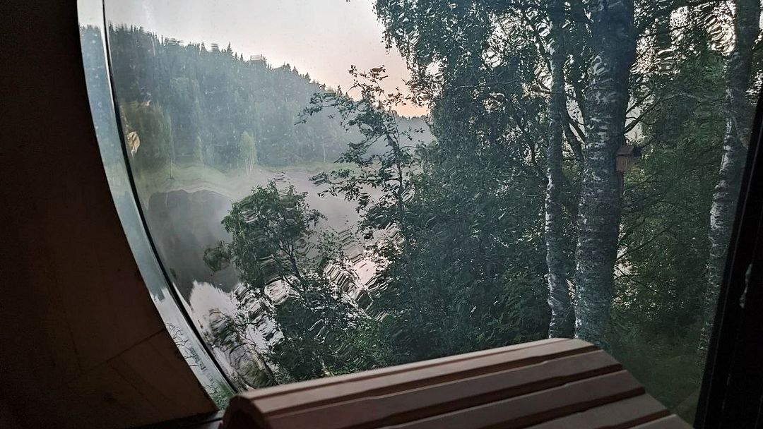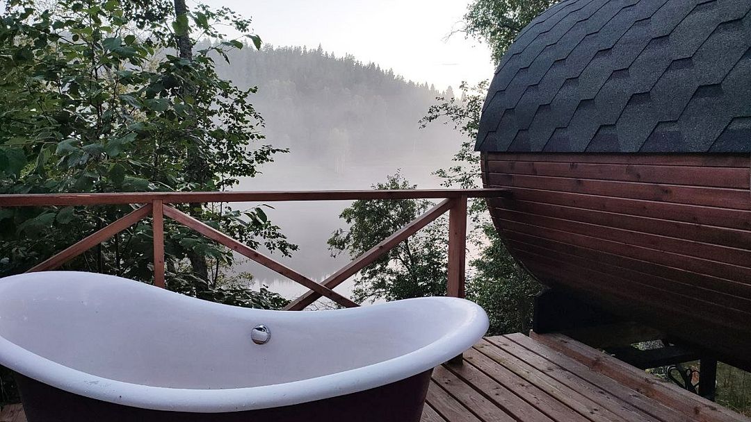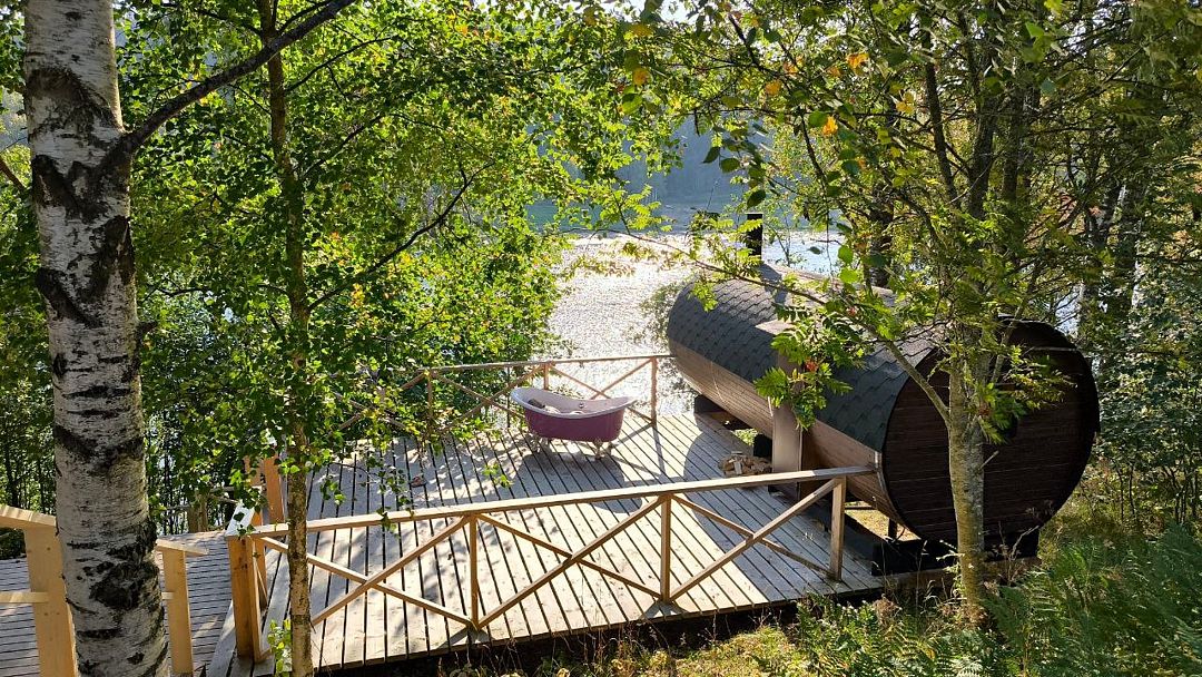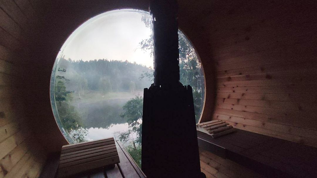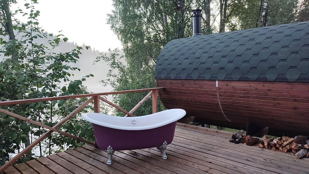 Баня-бочка с большим панорамным окном, из парилки вид на озеро.