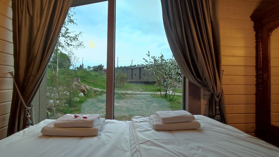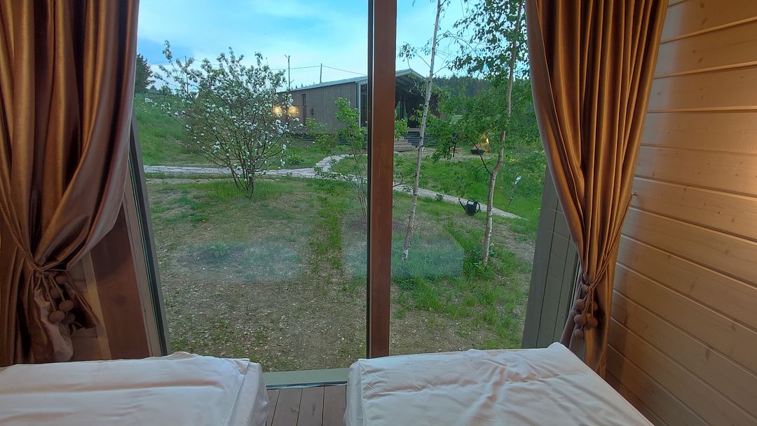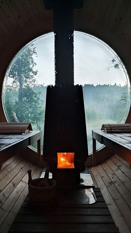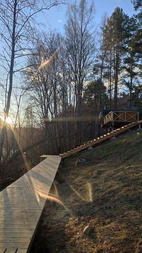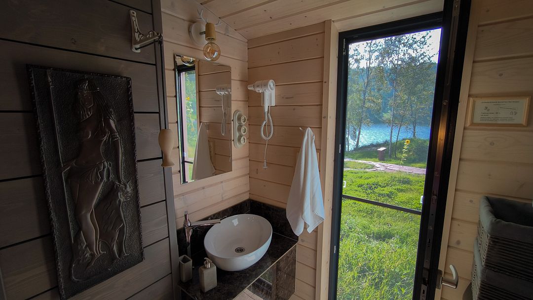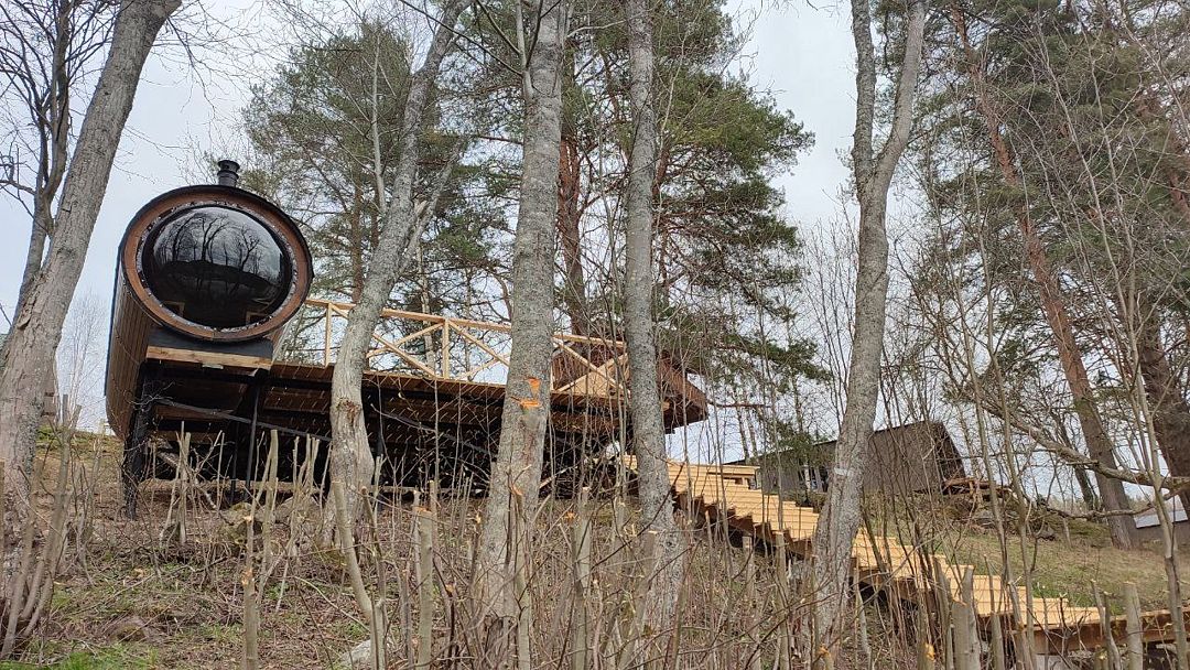 Баня-бочка с большим панорамным окном, из парилки вид на озеро.