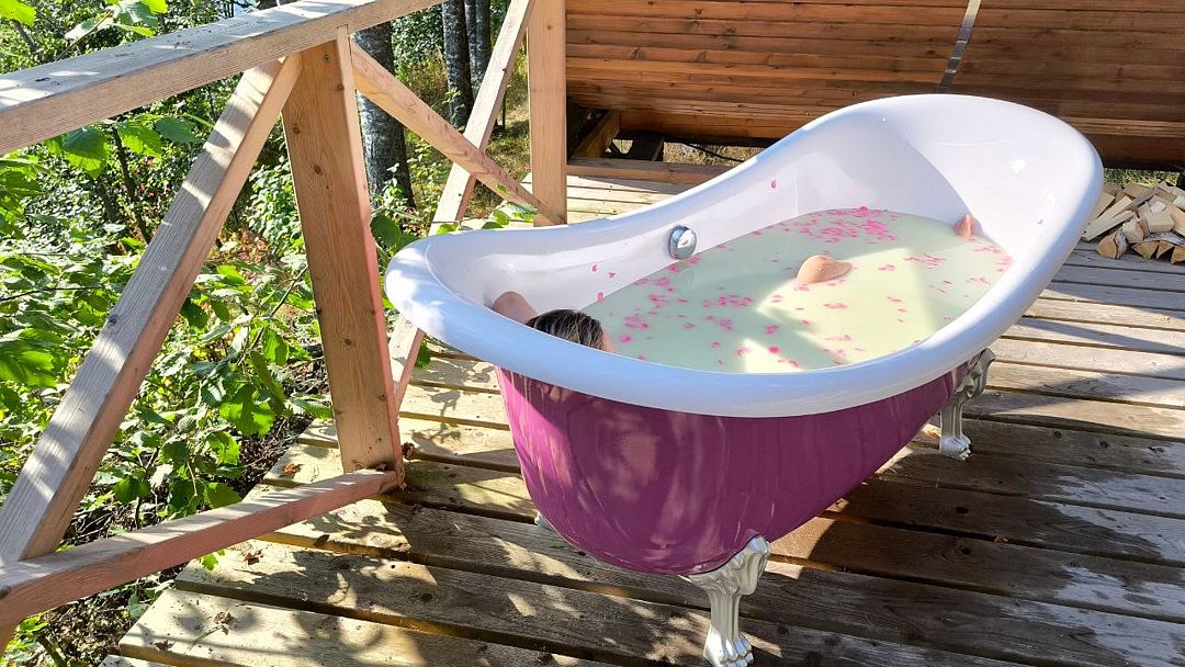 Также здесь, на этой площадке, установлена ванна для принятия сывороточных ванн в летний период — как отдельная опция для желающих понежиться, ощутить себя Клеопатрой, напитать себя любимую разными полезностями.