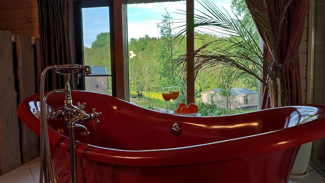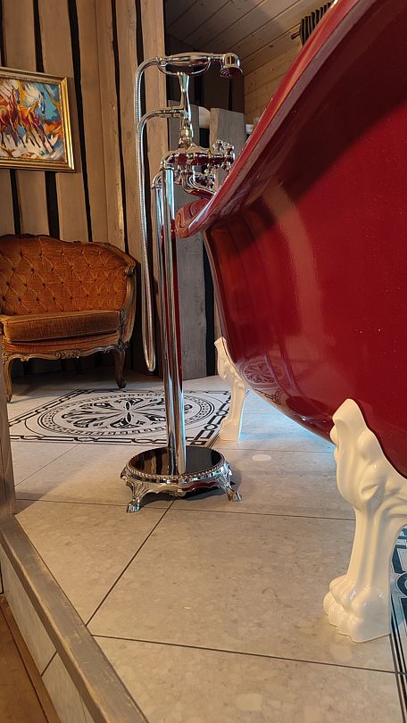 - красного мрамора отдельно стоящая у окна ванна на лапах,