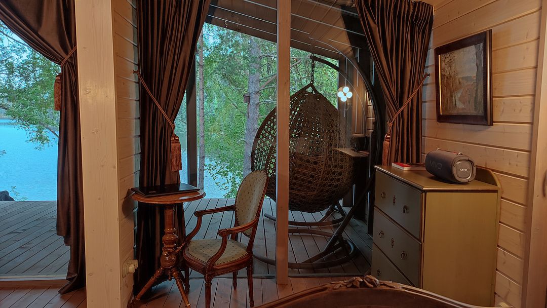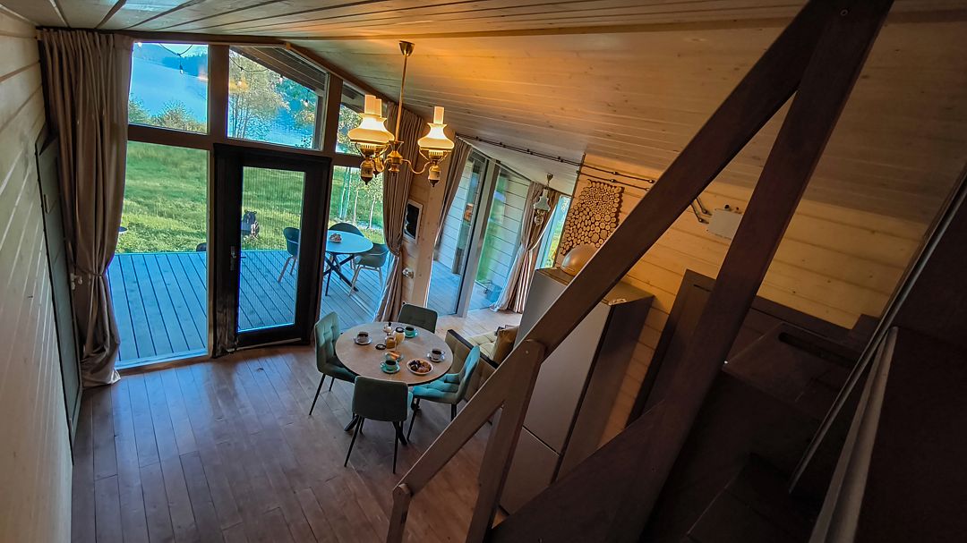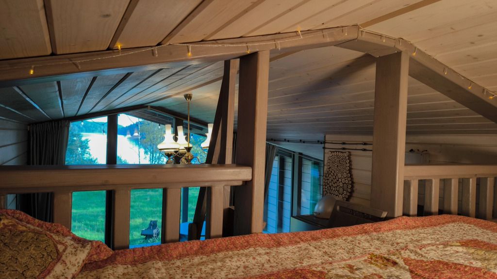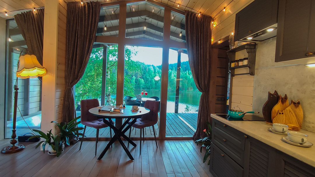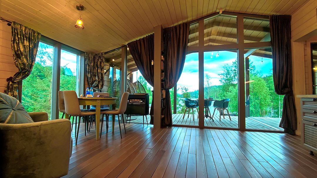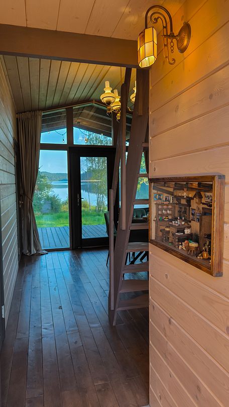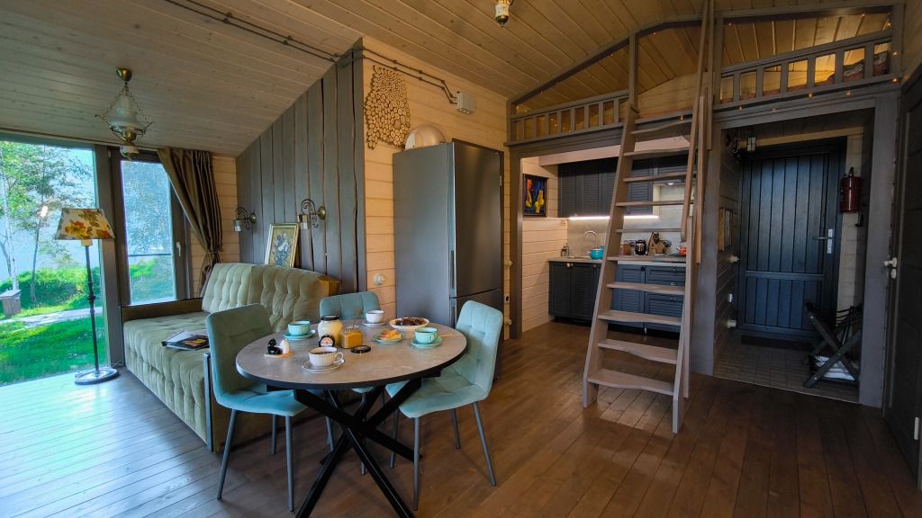 - небольшая гостиная имеет огромное панорамное стену-окно. Диван находится в уютном уголке, напротив панорамного окна. Уютные бра придадут Вашему отдыху комфорт и уют. Прямо из зала по лестнице «гусиный шаг» можно забраться под крышу, где в Вашем распоряжении лежанка, на которой удобно одновременно и любоваться видами озера, и поддерживать контакт с друзьями внизу. Читать книгу и просто …заснуть;