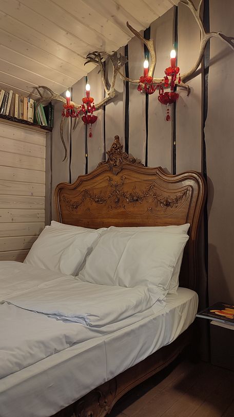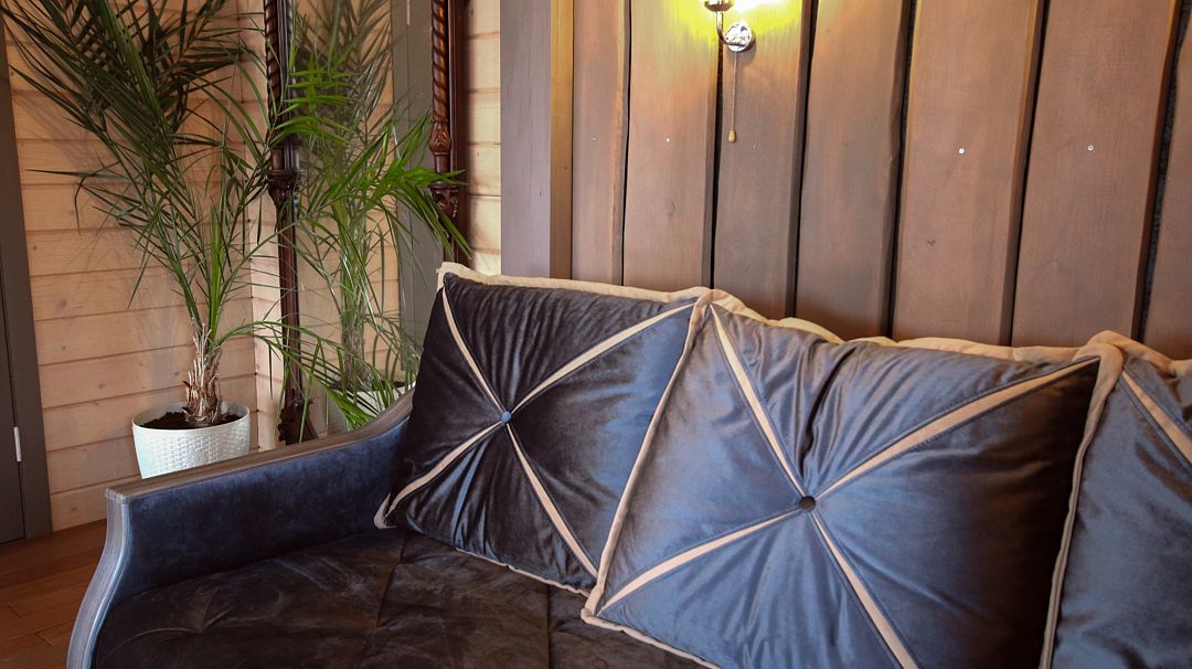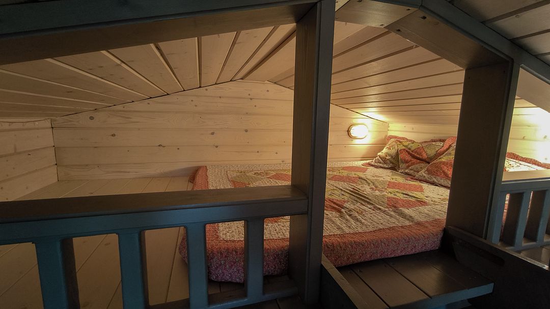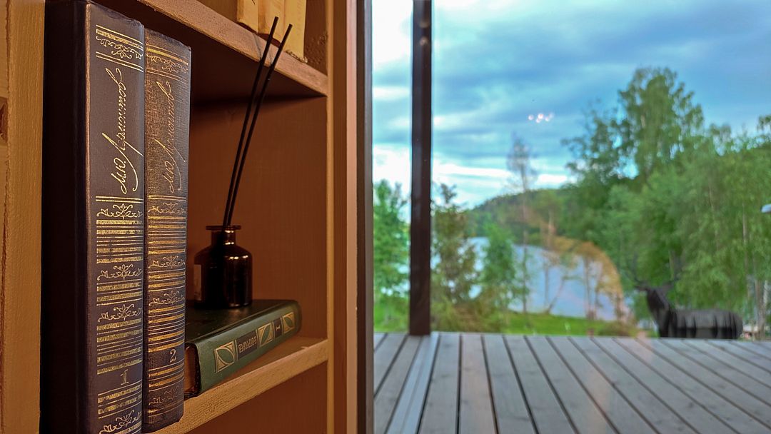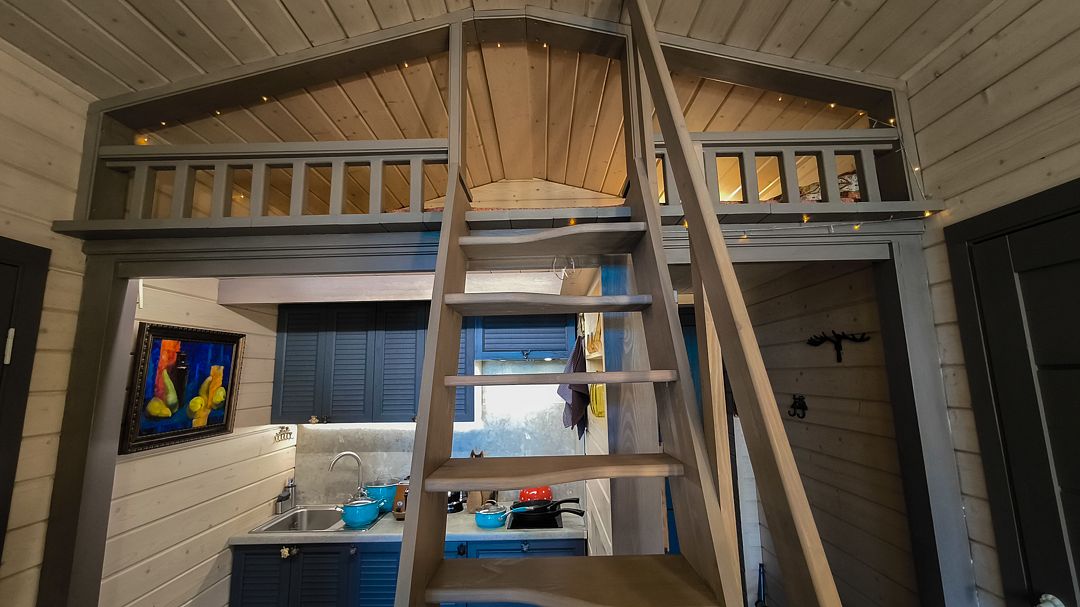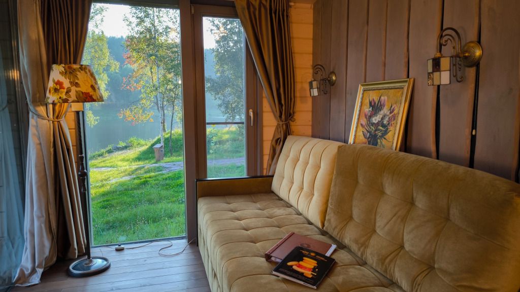 - небольшая гостиная имеет огромное панорамное стену-окно. Диван находится в уютном уголке, напротив панорамного окна. Уютные бра придадут Вашему отдыху комфорт и уют. Прямо из зала по лестнице «гусиный шаг» можно забраться под крышу, где в Вашем распоряжении лежанка, на которой удобно одновременно и любоваться видами озера, и поддерживать контакт с друзьями внизу. Читать книгу и просто …заснуть;