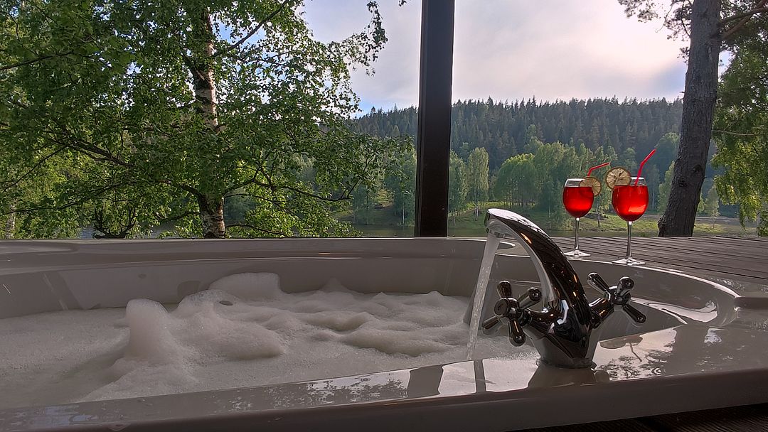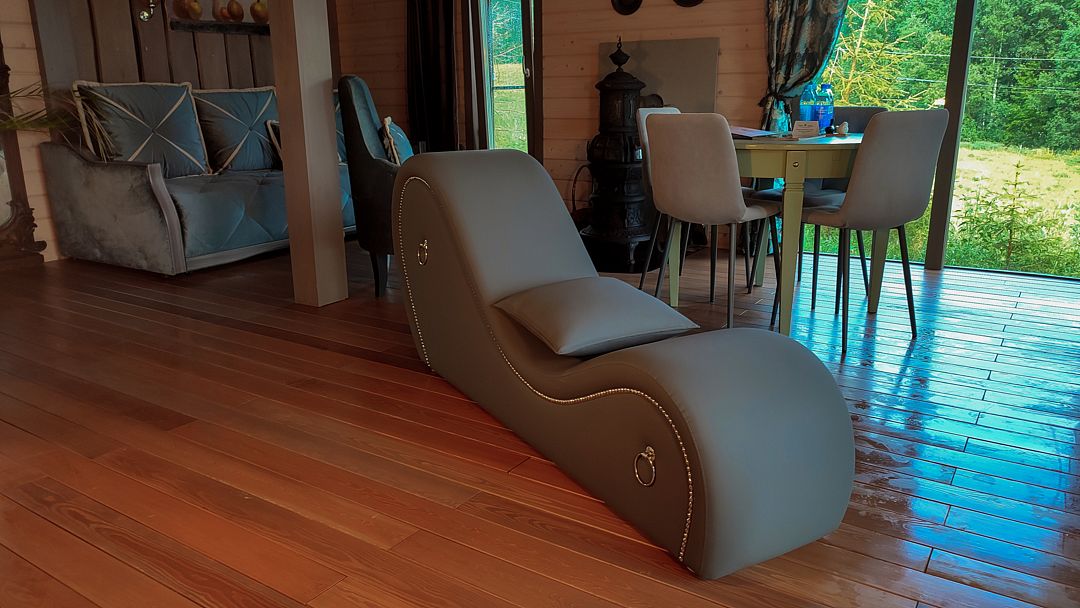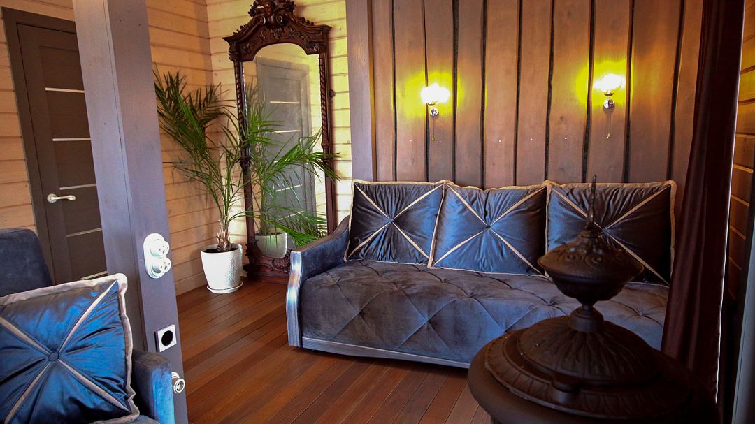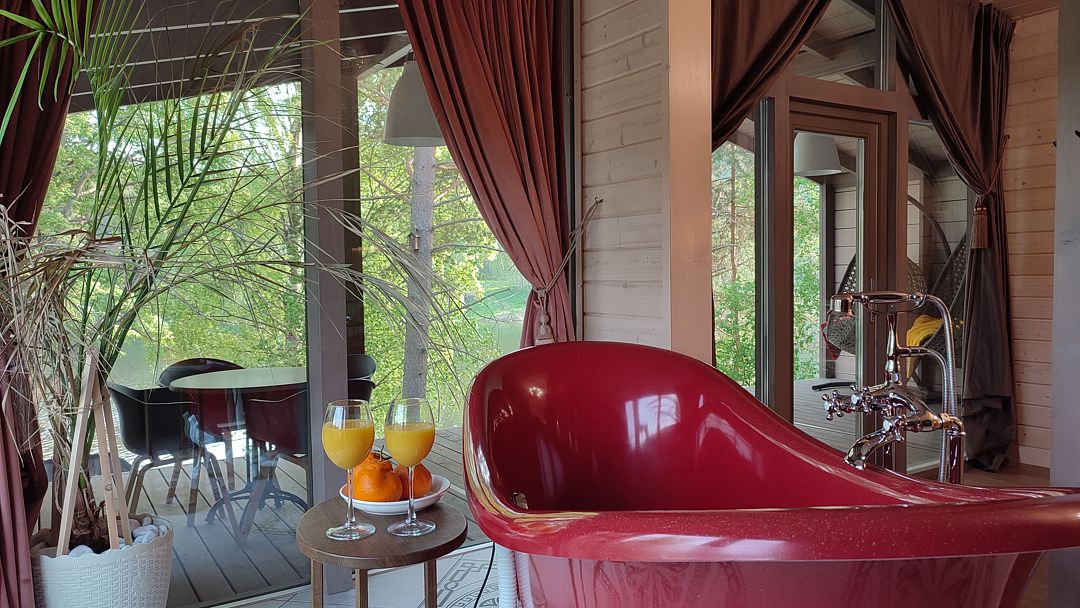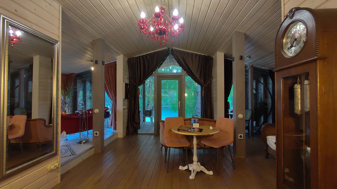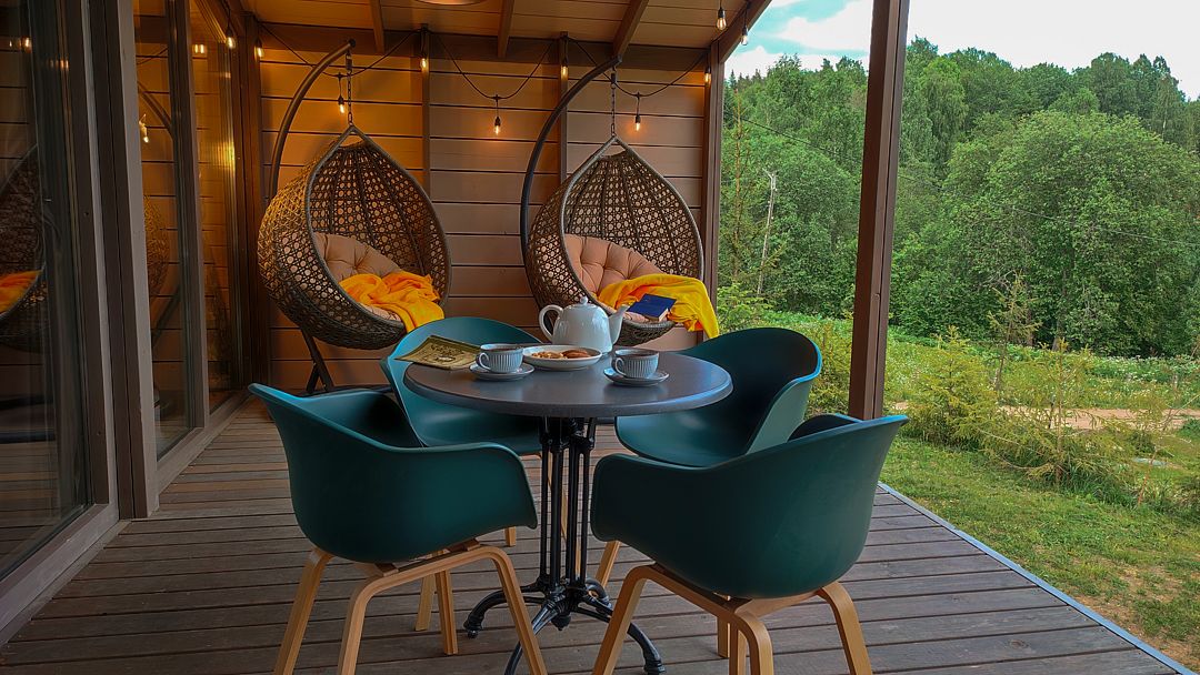 На террасе 2 кресла-качели, стол с 4 стульями и большая ванна на двоих, что реализует возможность принимать водные процедуры круглый год, несмотря на погоду.