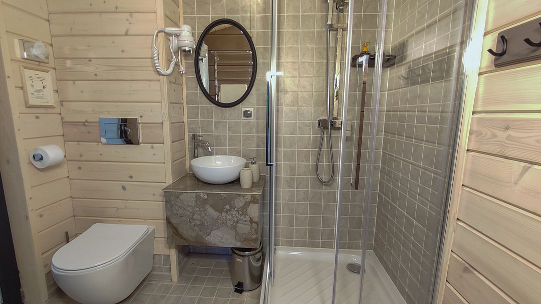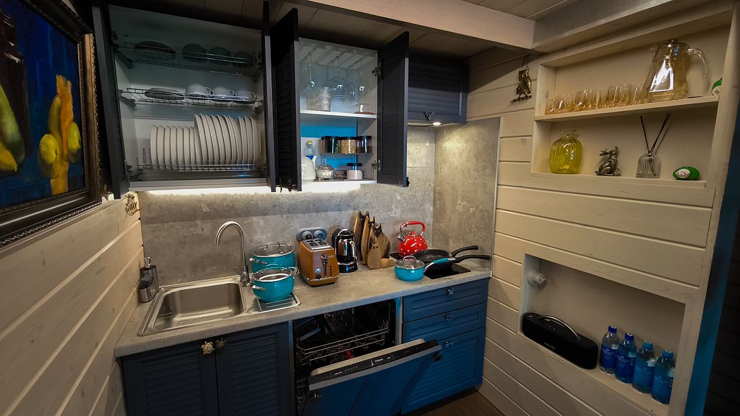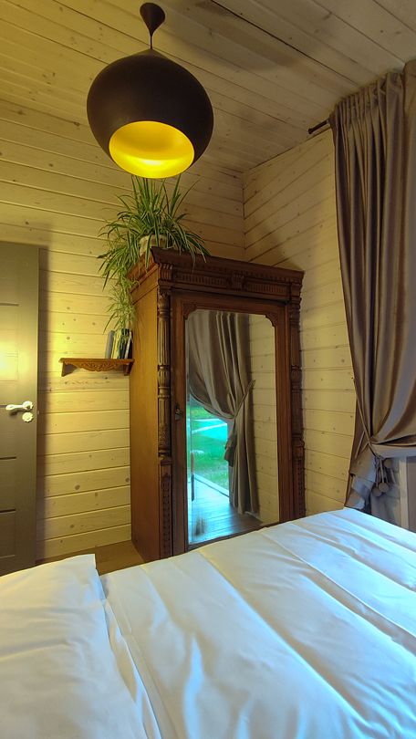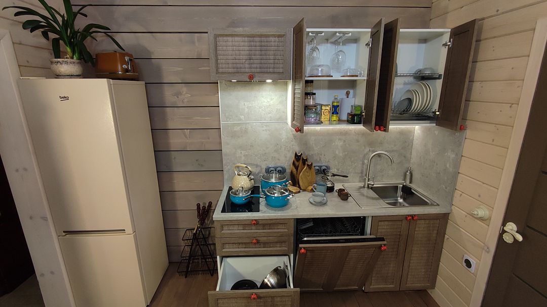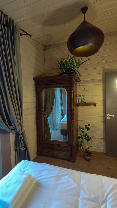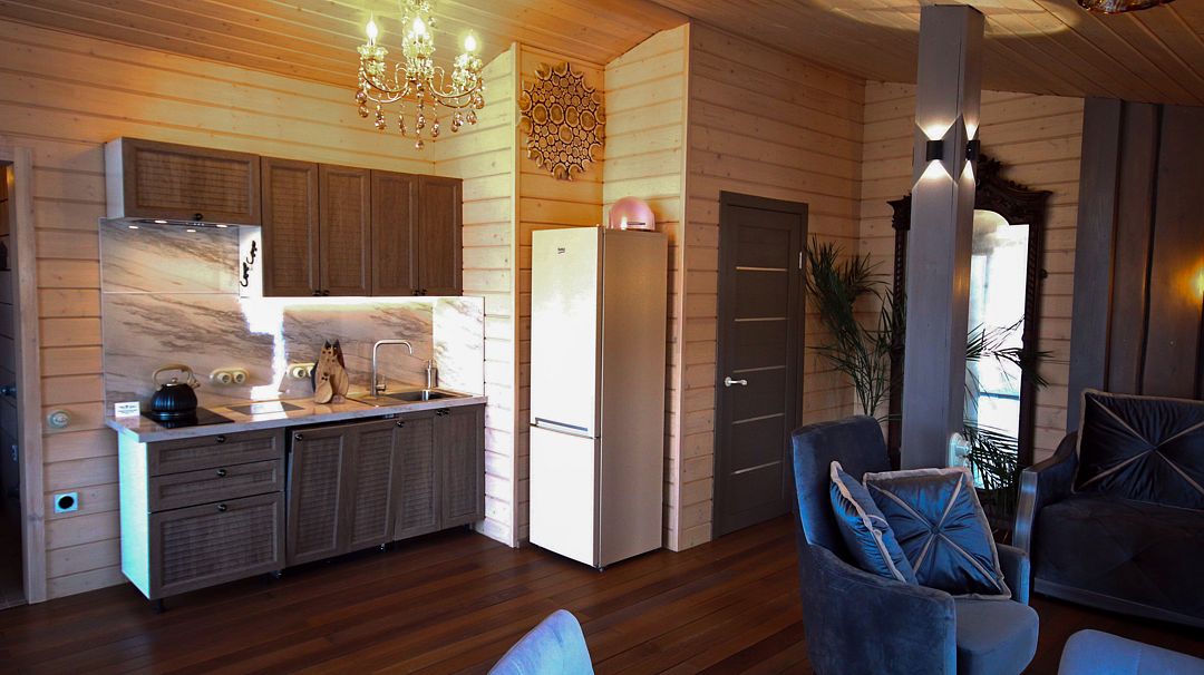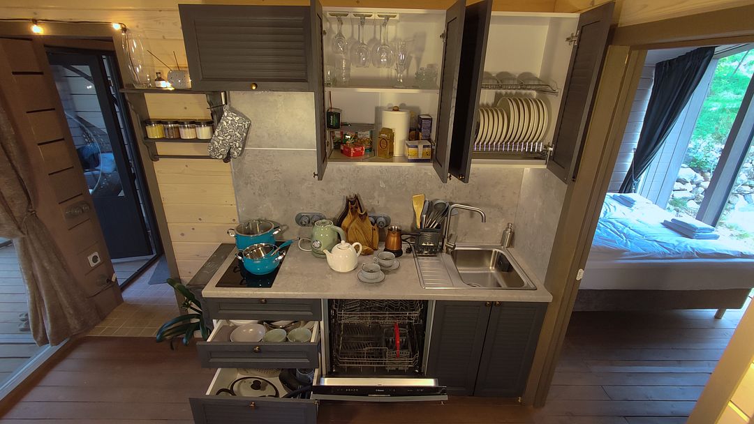 - изолированная ванная комната. Оборудованная кухня, спальная зона и гостиная имеют единое гармоничное пространство. Коттедж позволяет комфортно разместиться двум гостям.