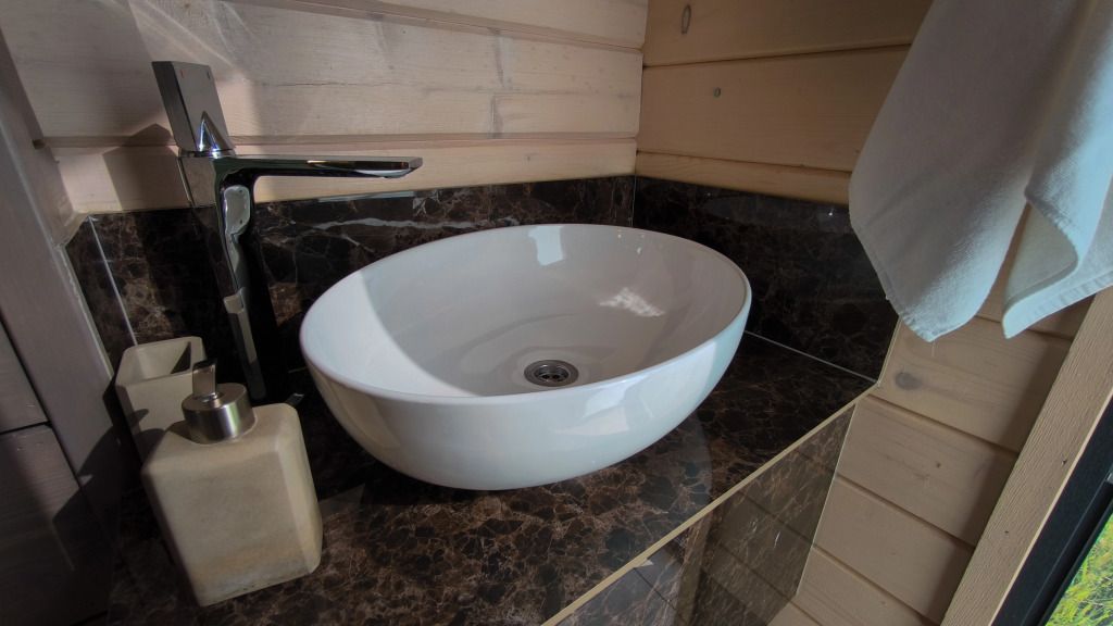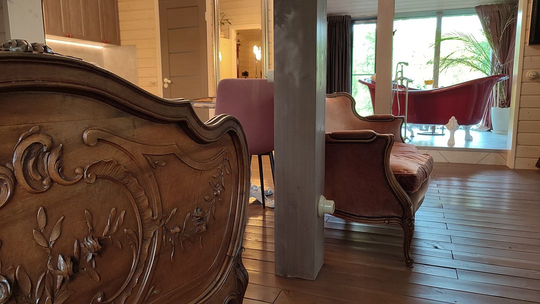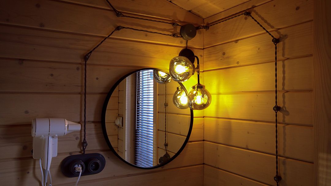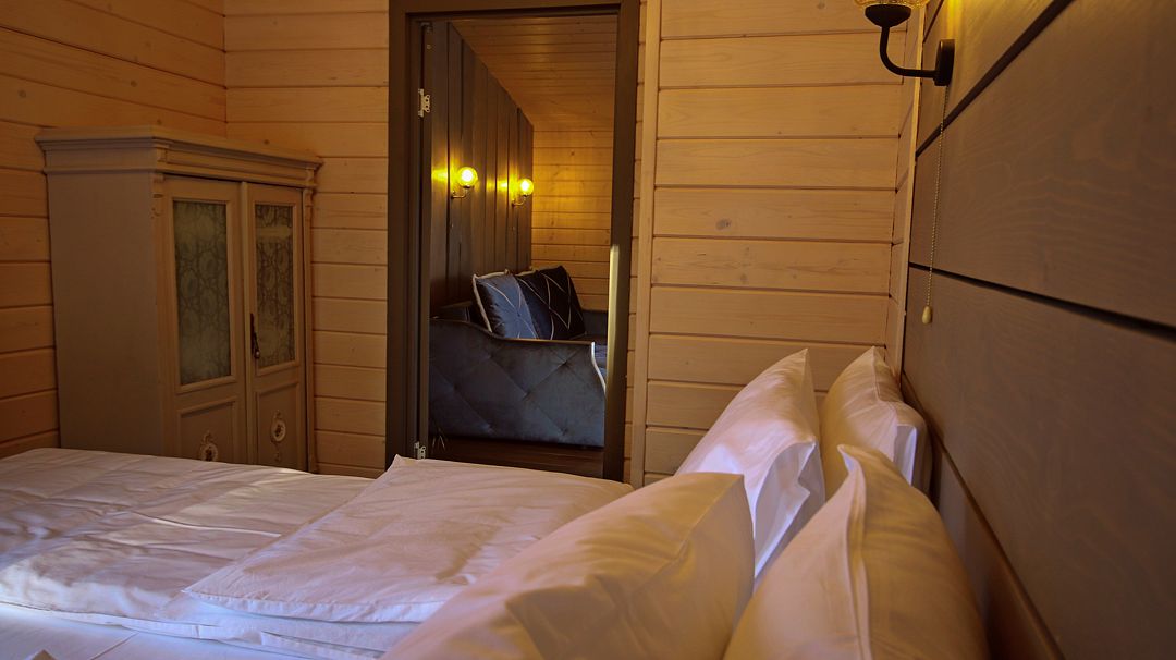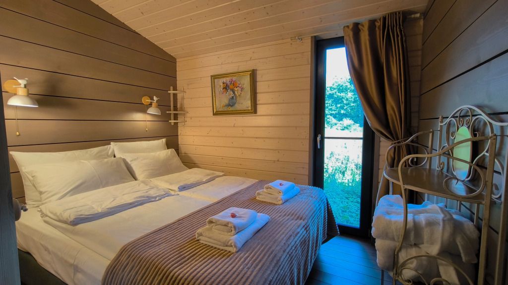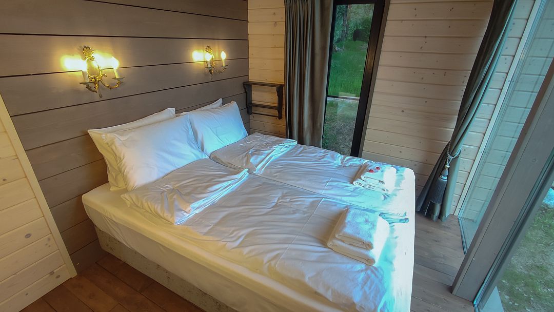 - изолированная ванная комната. Оборудованная кухня, спальная зона и гостиная имеют единое гармоничное пространство. Коттедж позволяет комфортно разместиться двум гостям.