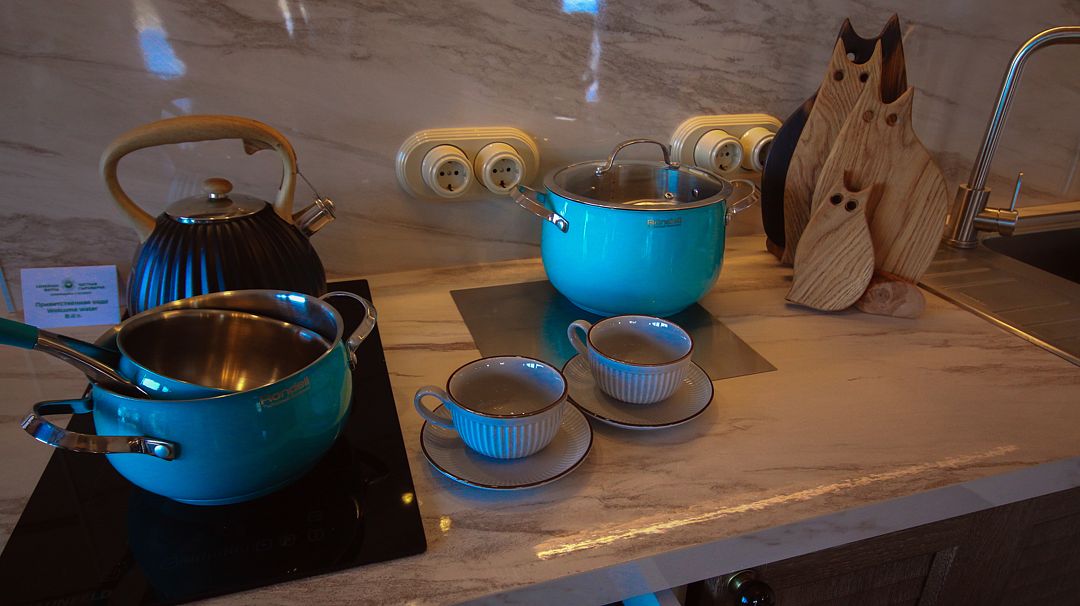 - чайник и посуда в Вашем распоряжении (кастрюли, сковородки, мисочки, салатницы, пиалки, тарелки, чашечки, фужеры, столовые приборы, прихватки для горячего, полотенца и др.), смотрите фотографии.