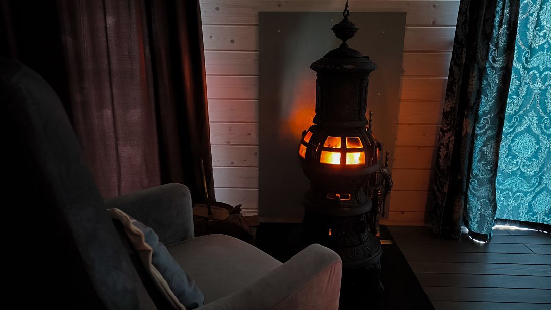 - старинное шикарное зеркало в раме с резьбой. Старинная чугунная печь-камин в форме маяка. Когда внутри горит огонь, сквозь окошки из слюды во все стороны видны отблески пламени. Винтажный проигрыватель пластинок Ригонда, прошедший реставрацию. Играет как винил, так и флэшку. Стильное и удобное тантра-кресло для медитации и глубокого релакса;