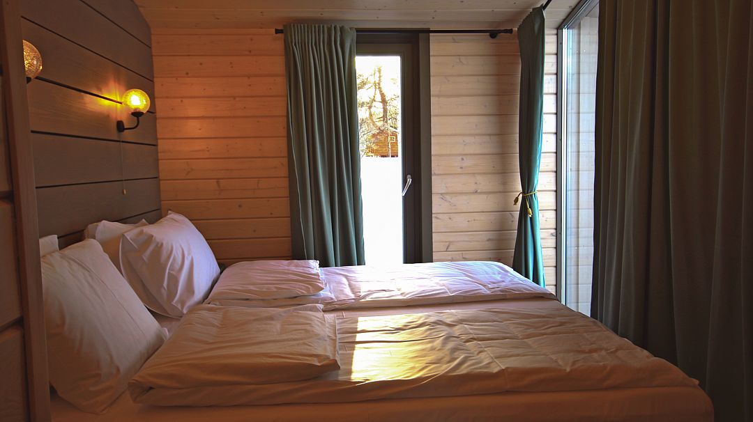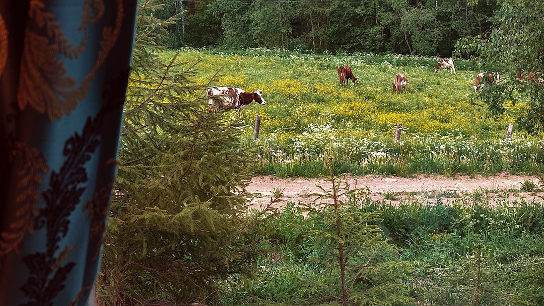 - 2 спальни. Окна одной выходят на поле, где пасутся коровы, за полем зеленый массив. Окна второй спальни смотрят на озеро;