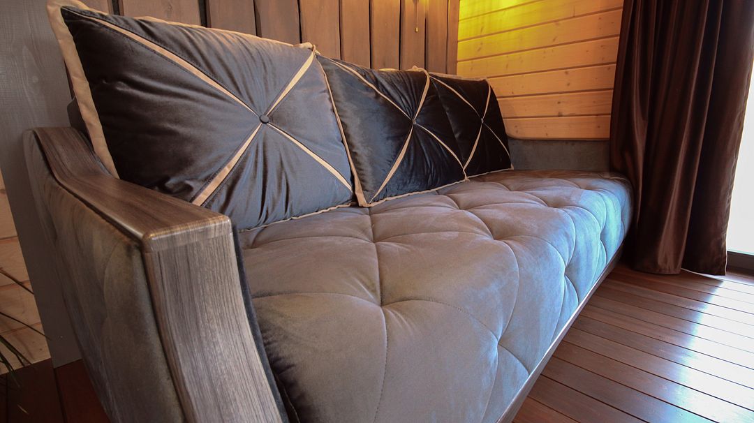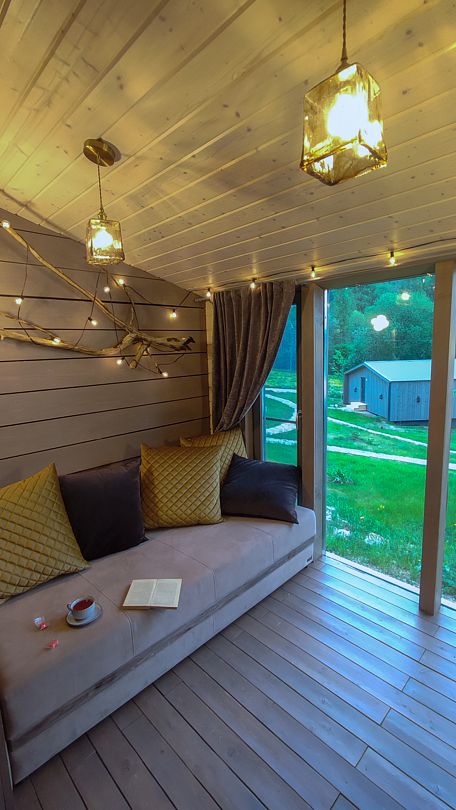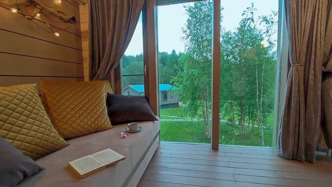 - панорамная стена-окно. Диван для отдыха, а также как спальное место для 2 человек;