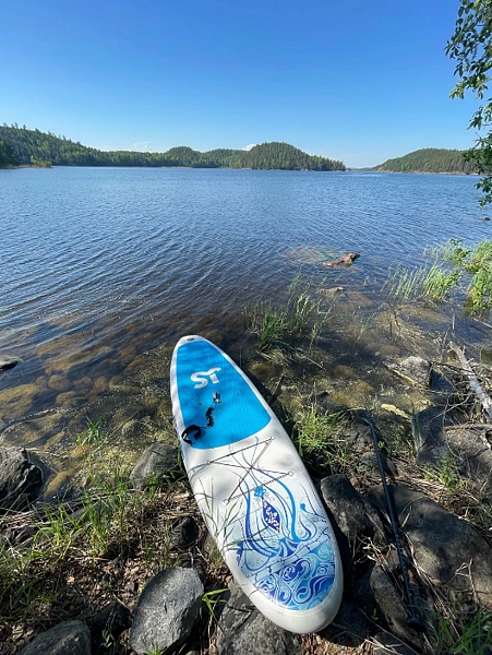 В комплект входит спасательный жилет, лиш и весло. Удобный спуск к воде в тихой лагуне Ладожских шхер — Вам всё покажут и расскажут.