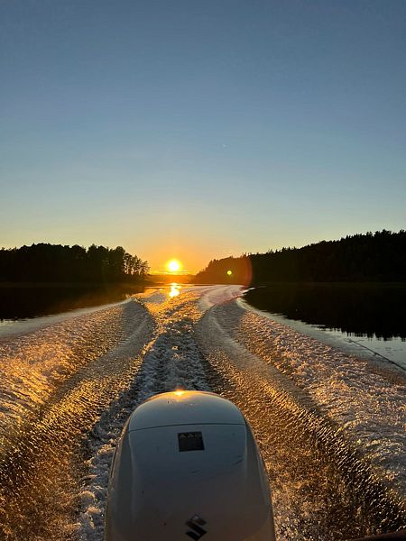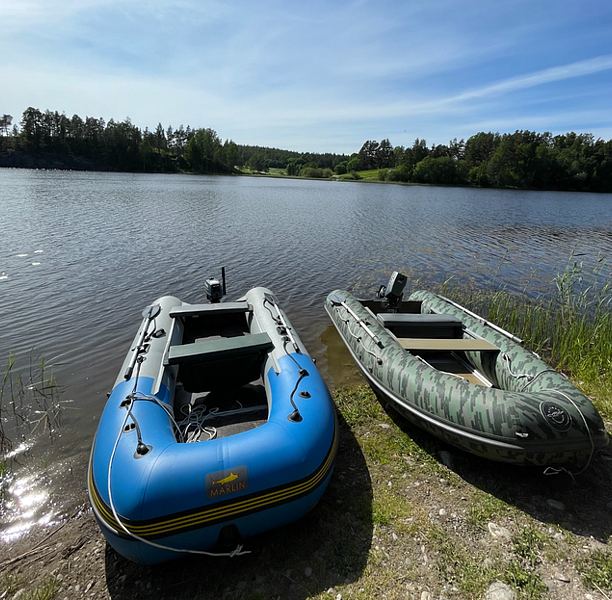 Аренда лодок с мотором в Карелии. В комплект аренды входит лодка с мотором до 5 л.с., спасательные жилеты и весла. Удобный спуск к воде в тихой лагуне Ладожских шхер.