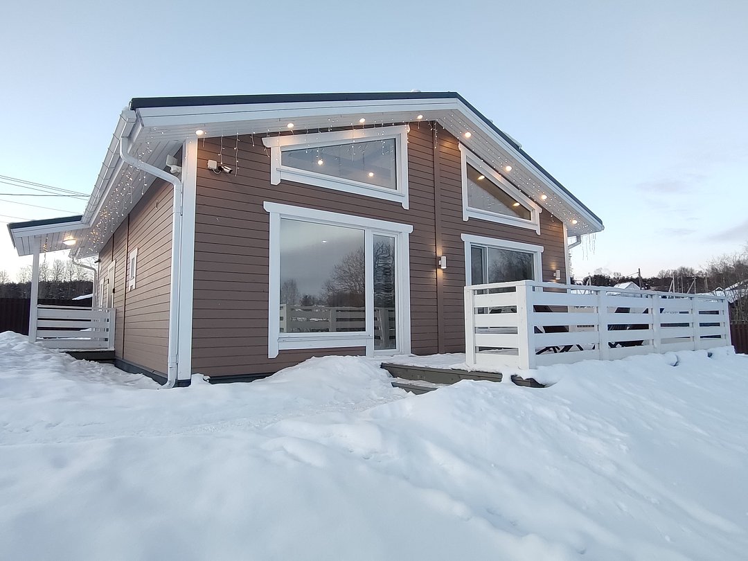 Новый коттедж в скандинавском стиле предлагает все необходимое для идеального отдыха: панорамные виды, финскую сауну, теплый пол, полностью оборудованную кухню, Wi-Fi и Smart TV.
