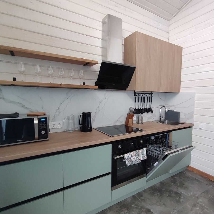 Есть все необходимое: 8 спальных мест+2 дополнительных, холодильник, стиральная машина, микроволновка, посудомоечная машина, тостер, мангал, чайник, варочная поверхность, духовой шкаф, качественная посуда и т.д. Есть Wi-Fi и smart TV, шустрый интернет для тех, кому приходится удаленно работать даже на отдыхе.