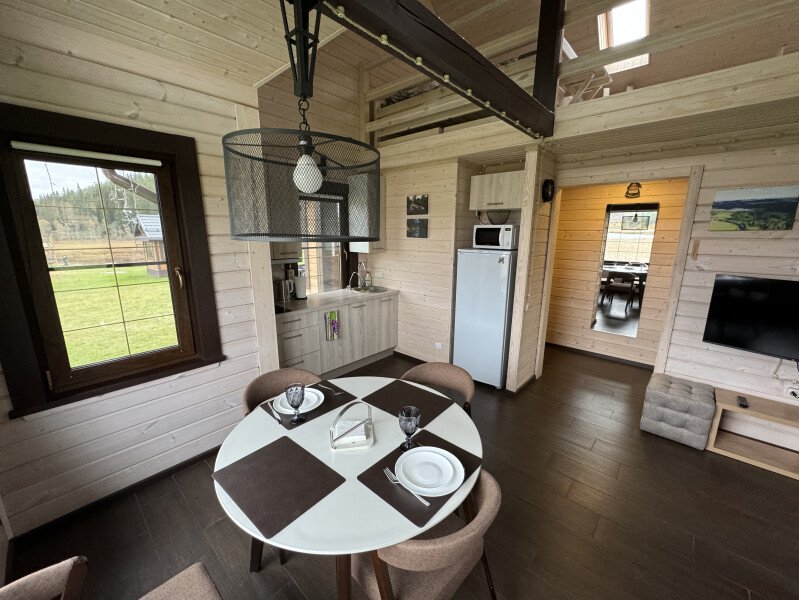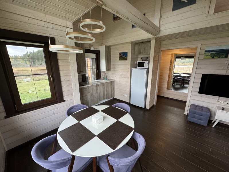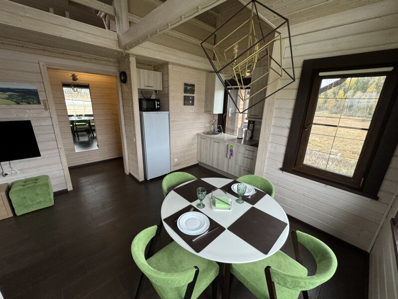 Каждый коттедж выполнен в авторском стиле и оснащен всем необходимым для комфортного проживания. В распоряжении гостей — полностью оборудованная кухня с индукционной плитой, микроволновой печью и посудомоечной машиной, что позволяет готовить любимые блюда с максимальным удобством.