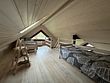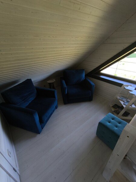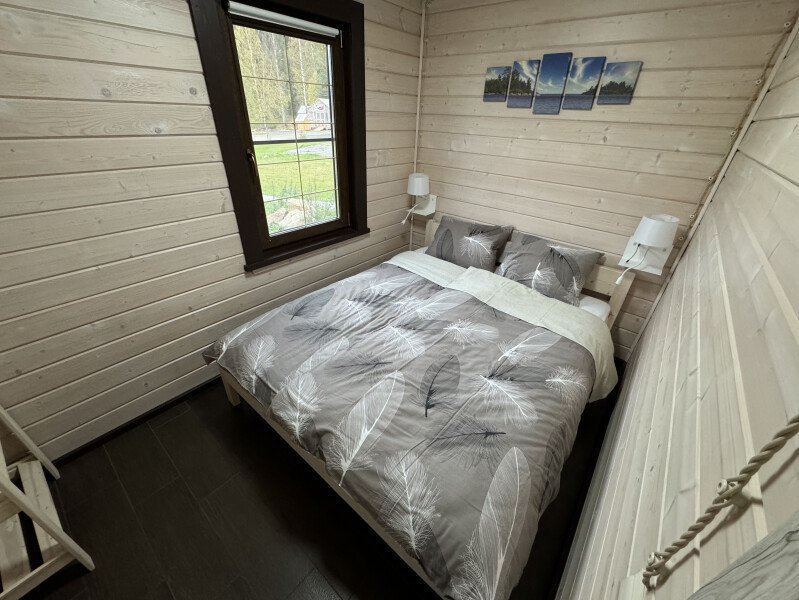 Площадь: 65 м² + просторная веранда (16 м²) под крышей, вместимость: до четырех гостей. Вариант размещения — дом с двумя отдельными спальнями, в каждой – комфортная двуспальная кровать. Альтернативные варианты размещения — дом с уютной спальней (двуспальная кровать) и дополнительными местами на лофте (две односпальные кровати).
