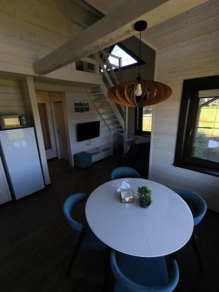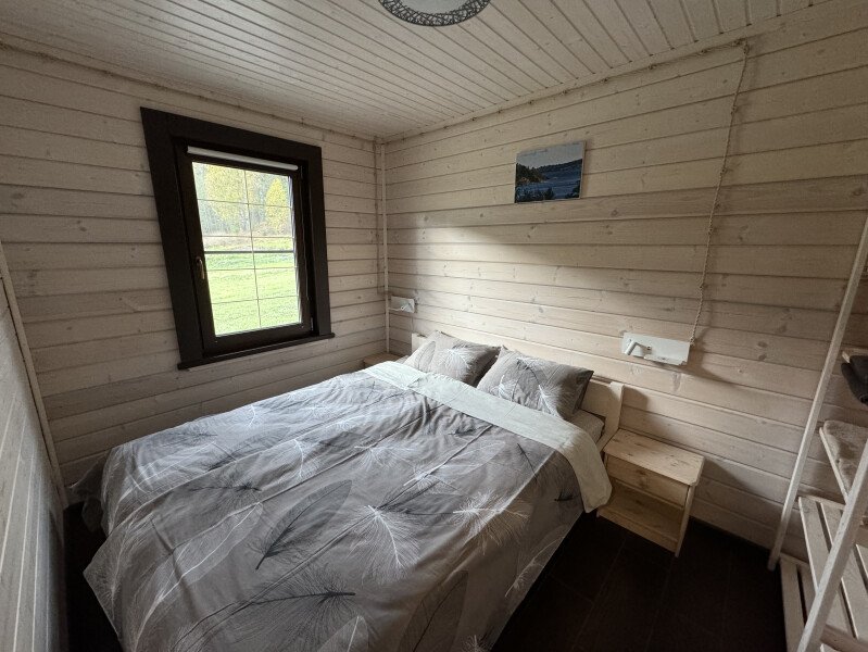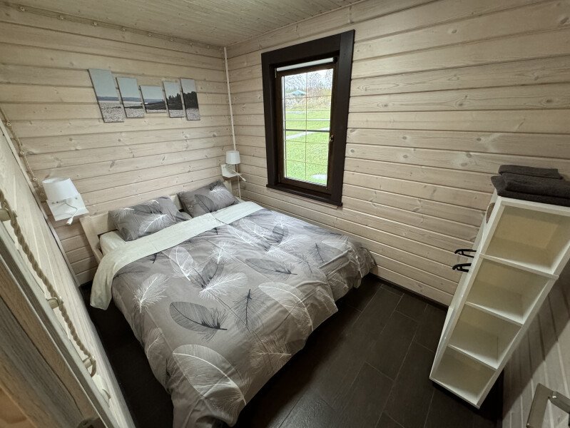Площадь: 65 м² + просторная веранда (16 м²) под крышей, вместимость: до четырех гостей. Вариант размещения — дом с уютной спальней (двуспальная кровать) и дополнительными местами на лофте (две односпальные кровати). Альтернативные варианты размещения — дом с двумя отдельными спальнями, в каждой – комфортная двуспальная кровать.