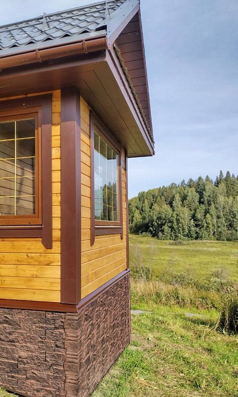 Коттедж из клееного бруса площадью 65 м² с верандой под крышей площадью 16 м². Максимальная вместимость коттеджа — четыре человека.