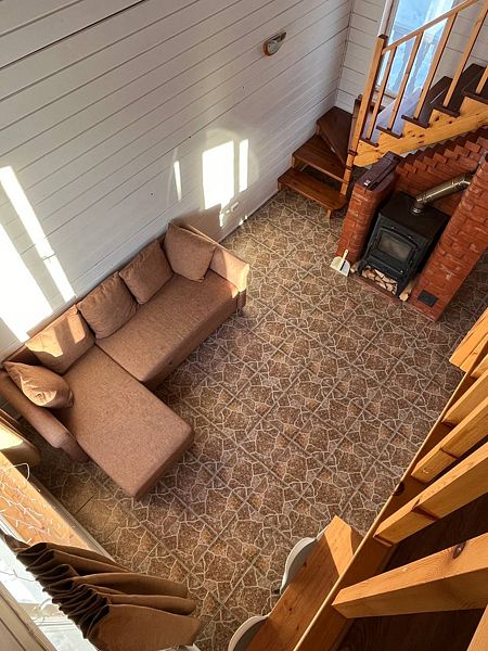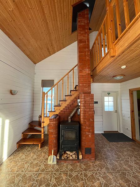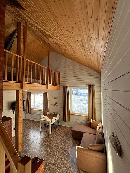 Дом рассчитан на 5 персон. Первый этаж: прихожая; кухня, совмещенная с гостиной; санузел и душевая. Раскладной диван. Коттедж оборудован камином. Второй этаж: спальня с одной односпальной и двухспальной кроватями, балкон.