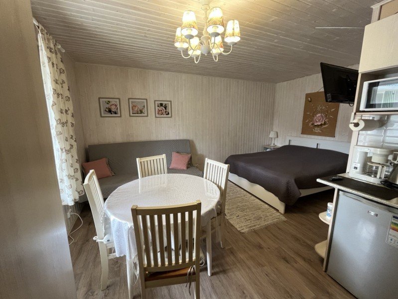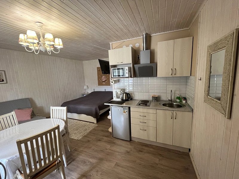 Номер студия 25 м.кв, с кухонной зоной, санузла (душ, туалет раковина). Двуспальная кровать и раскладной диван. Размещение 2+2.