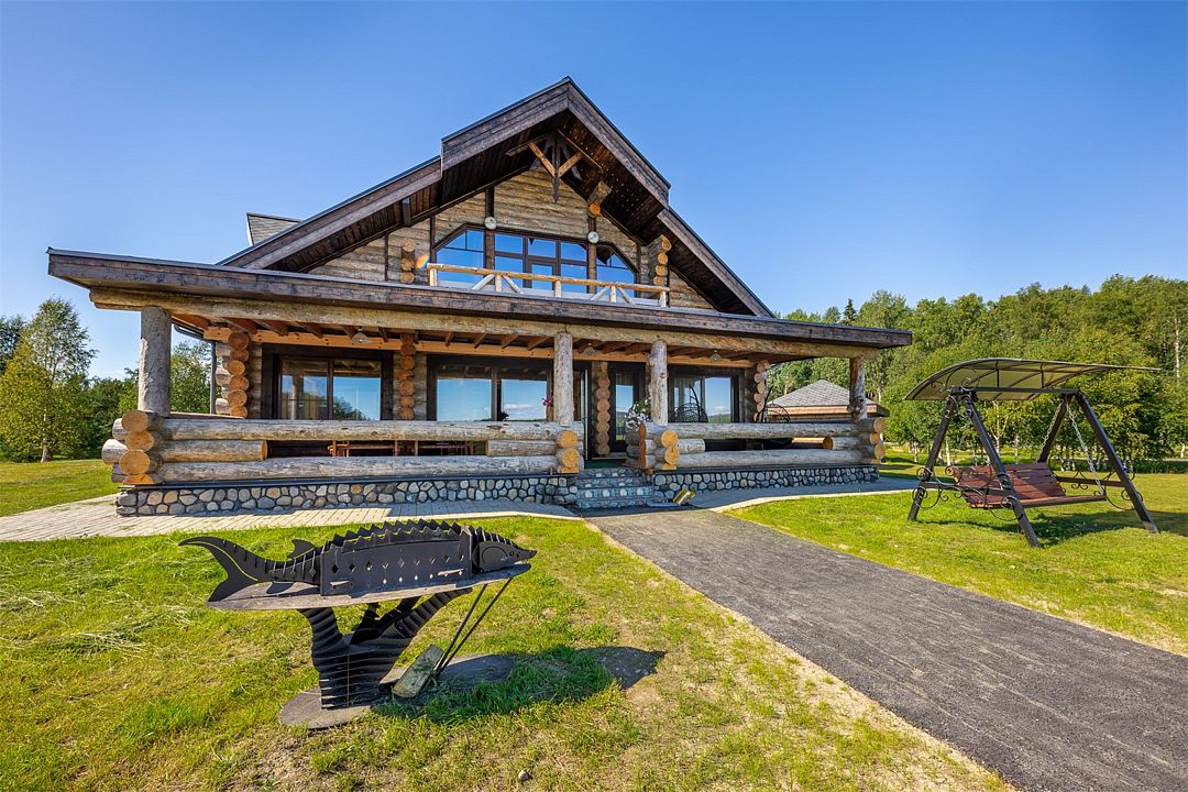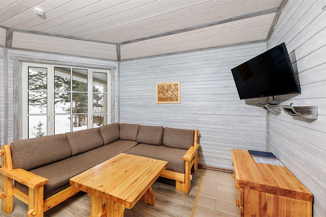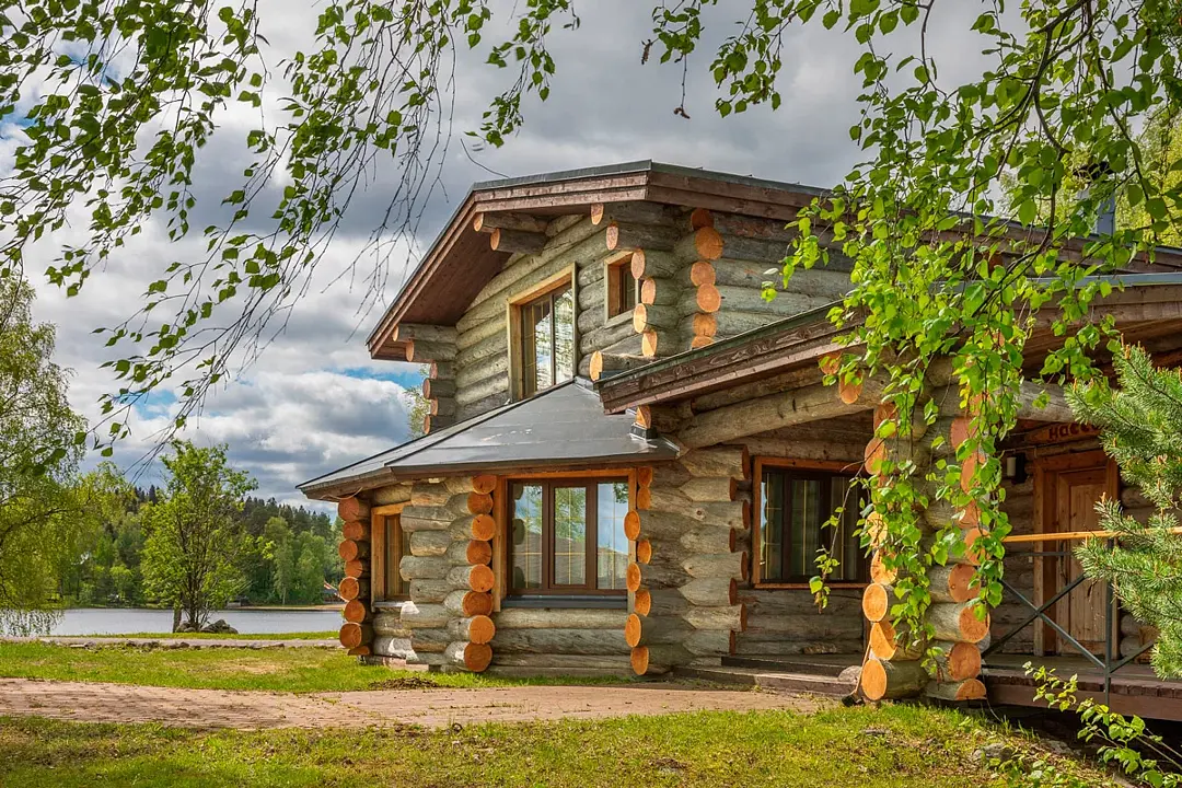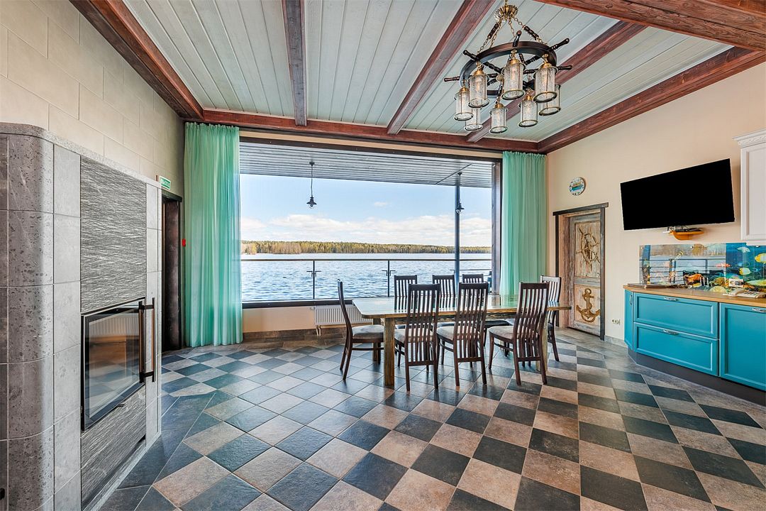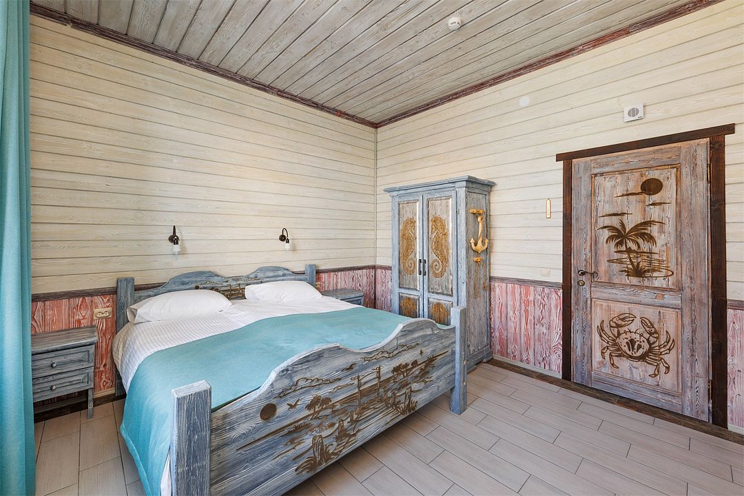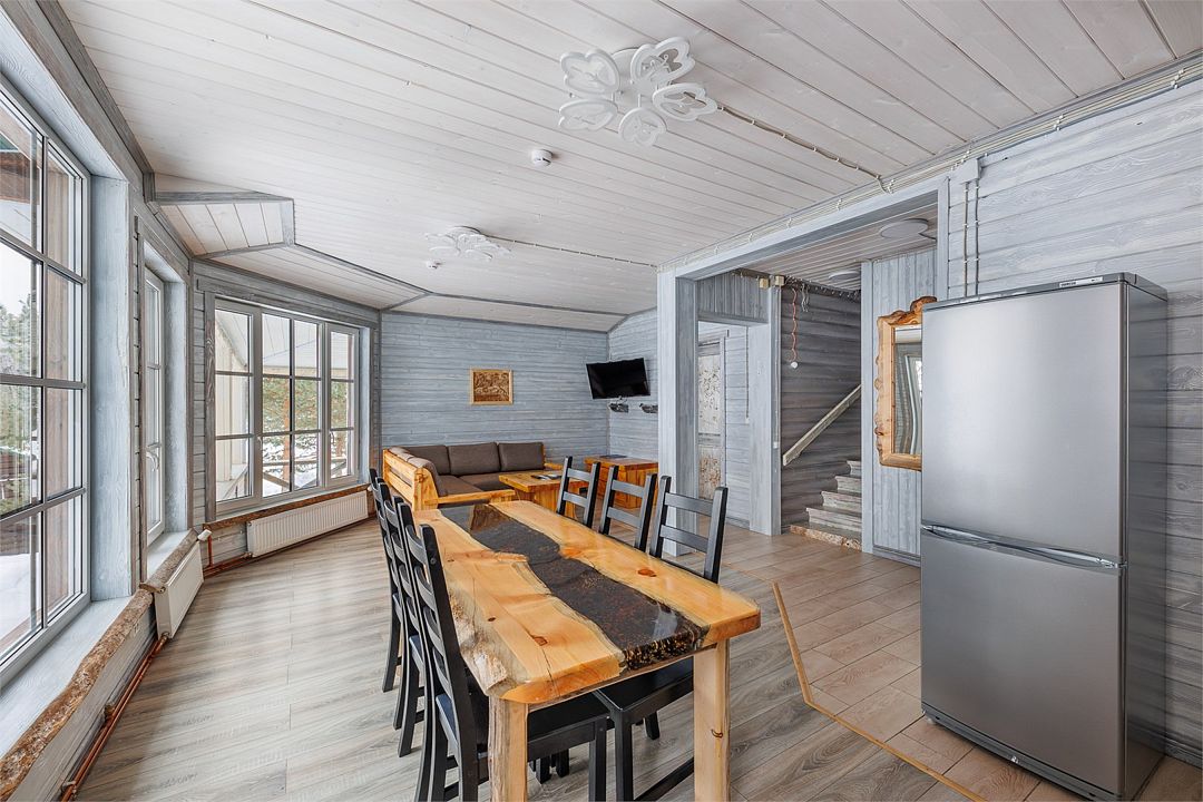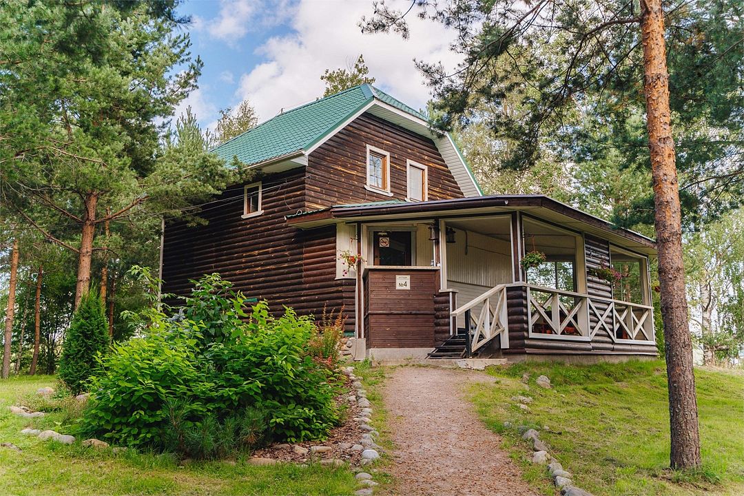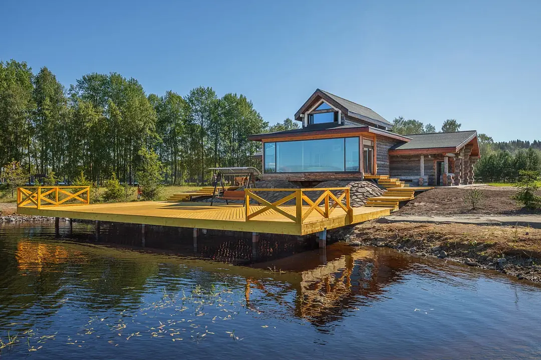 6 местный хаусбот на мысу. Одноэтажный деревянный коттедж с тремя спальнями (в каждой спальне есть туалет и душ), гостиная с камином и оборудованной кухней, две сауны: инфракрасная и финская, терраса на крыше. Рядом с коттеджем имеется мангальная зона.