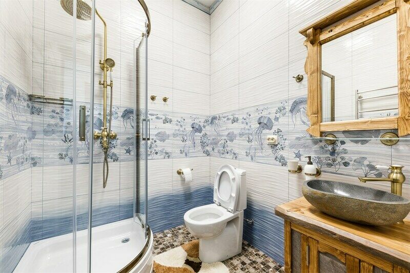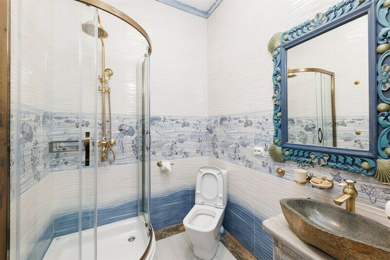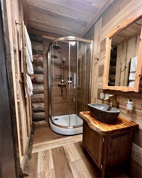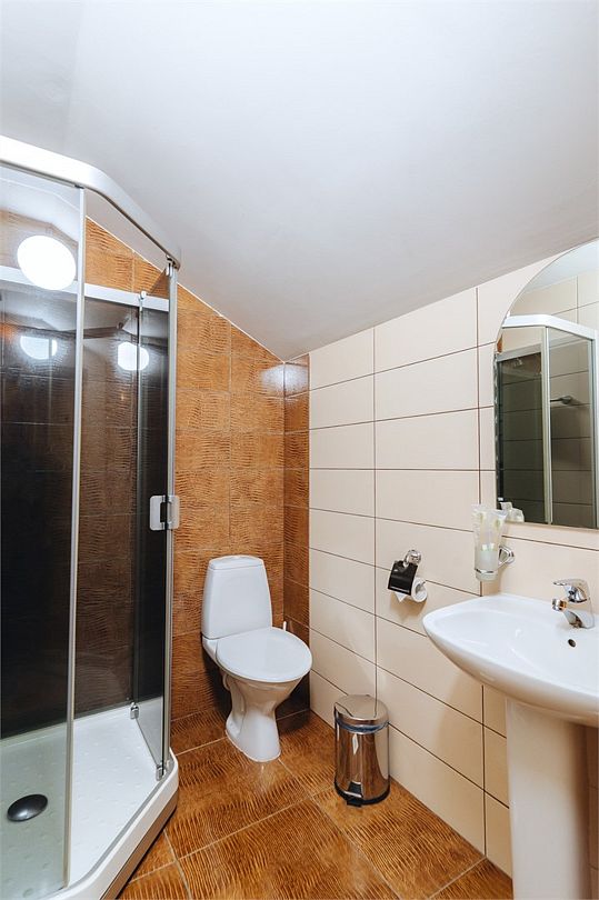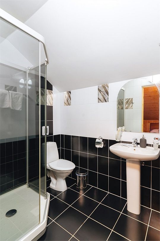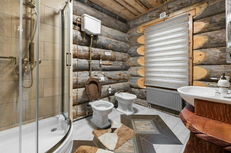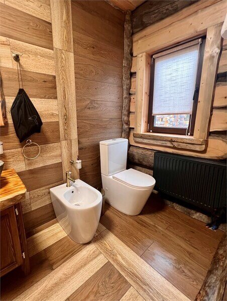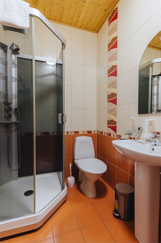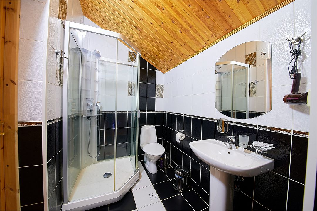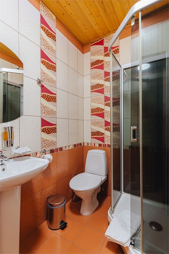Удобства: душ, туалет, фен, биде, полы с подогревом, полотенца, тапочки, халаты, косметический набор (гель для душа, шампунь, кондиционер, бальзам для тела, зубной набор, ватные диски/палочки, шапочка для душа).