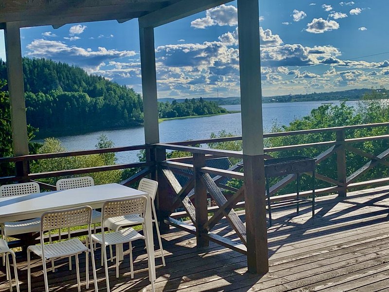 Виды заповедника Ладожские шхеры открываются прямо из окон дома и большой мангальной беседки у воды. На обширной террасе с видом на Ладогу расположена зона отдыха с барбекю, гости могут спуститься к собственному пирсу и искупаться, на берегу есть уличная мебель и шезлонги, чтобы позагорать, а также можно половить рыбу.