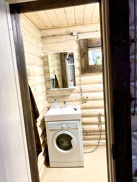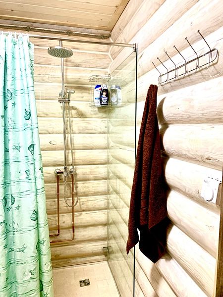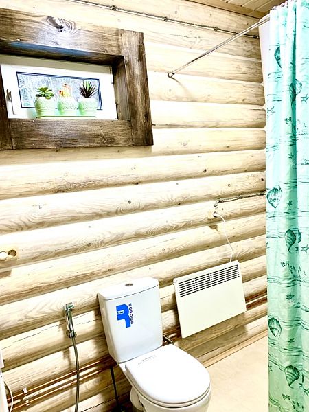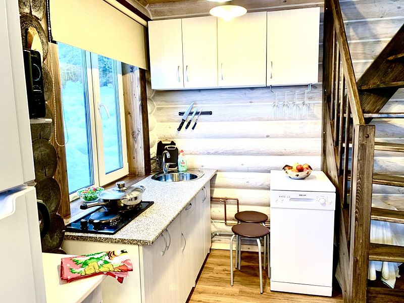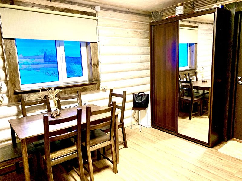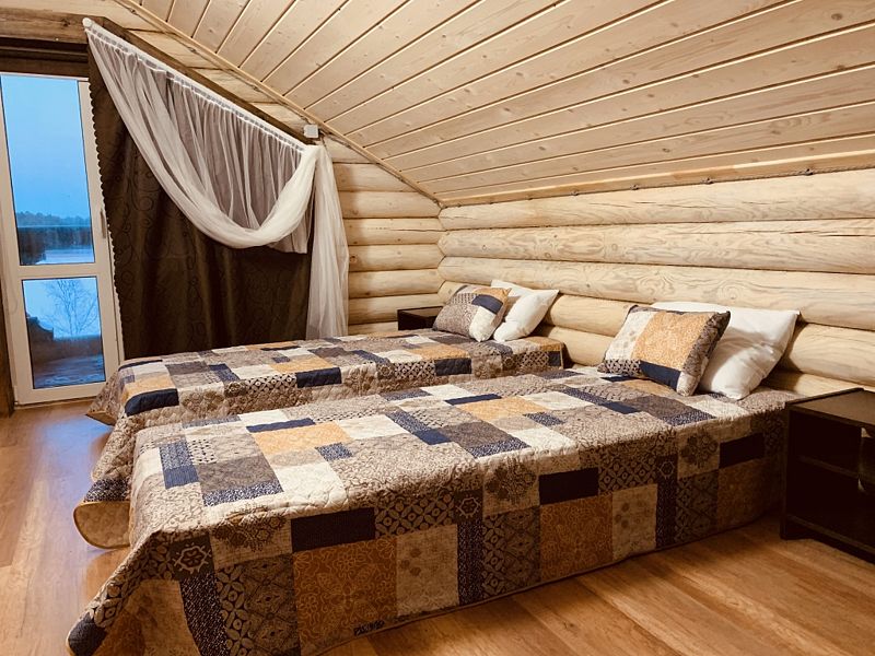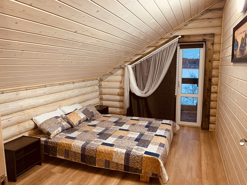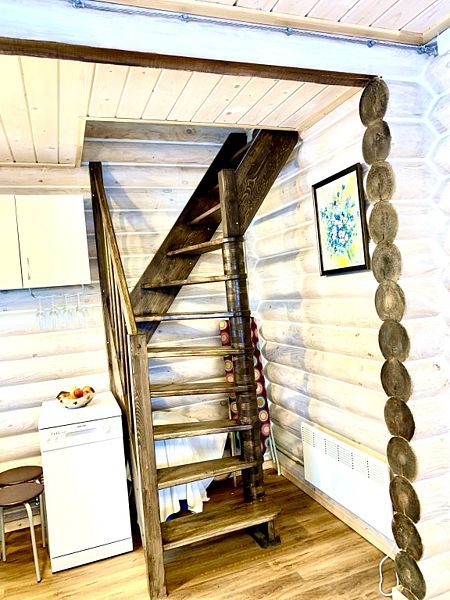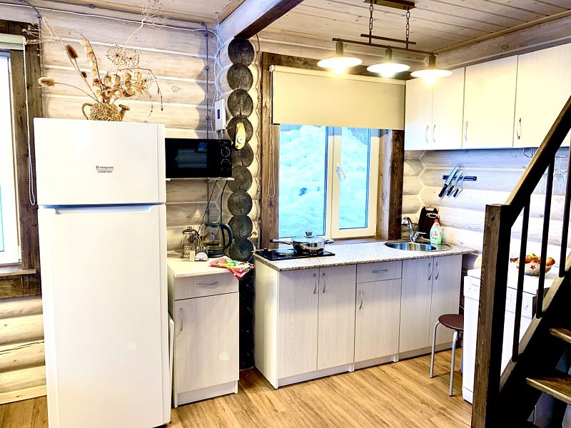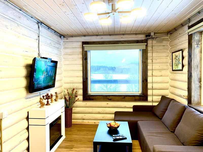 Новый дом из экологически чистого карельского бревна. Максимальная вместимость коттеджа — 7 взрослых, дополнительно может предоставляться складная односпальная кровать для взрослого, а также кроватка и стул для кормления для ребёнка до 3-х лет. Имеются все городские удобства, новая современная бытовая техника, большой ассортимент посуды для сервировки стола и приготовления пищи. Работает мобильная связь и быстрый Wi-fi на всей территории. Для отопления есть камин, тёплый пол и электрорадиаторы в каждой комнате. В коттедже 4 комнаты. На первом этаже: 1 комната — возможна установка складной комфортабельной кровати, 2 комната — гостиная совмещена с кухней, есть большой двуспальный угловой диван-кровать. На втором этаже есть две изолированные спальни: 1 спальня с двумя односпальными кроватями, их можно составить вместе, и получится двуспальная; и 2 спальня с большой двуспальной кроватью.