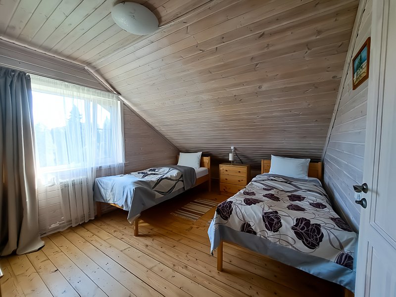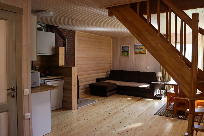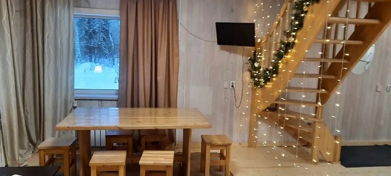 Коттедж разделен на две части и сдается по половинам с отдельным входом, террасой. мангальной зоной, парковкой. В каждой части двухэтажного дома есть: гостиная-кухня на первом этаже с камином, обеденной зоной, диваном и санузлом. Мансарда с двумя раздельными спальнями, ванной комнатой с душем. В спальнях 1 двуспальная и 2 односпальные кровати. Кухня оборудована всей необходимой посудой и техникой. В санузле теплый пол.