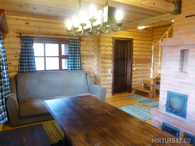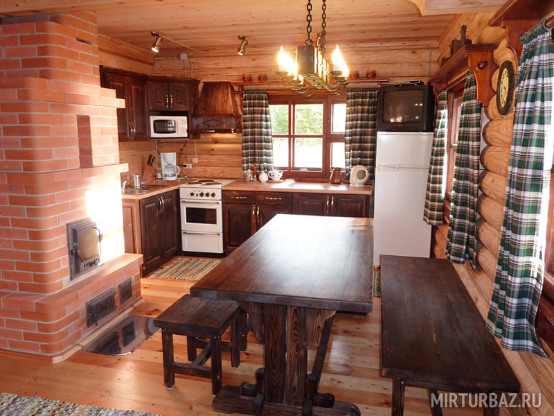 Кухня укомплектована всем необходимым для самостоятельного приготовления пищи (электроплита с духовкой, микроволновая печь, холодильник, чайник, кофеварка, вся необходимая посуда). Массивный обеденный стол, широкая деревенская лавка и тяжёлые табуреты дарят ощущение надёжности и располагают к долгой задушевной беседе. Рядом стоит огромный 2-х спальный раскладной диван, для комфортного просмотра телевизора, DVD с любимыми фильмами, караоке или прослушивания музыки.