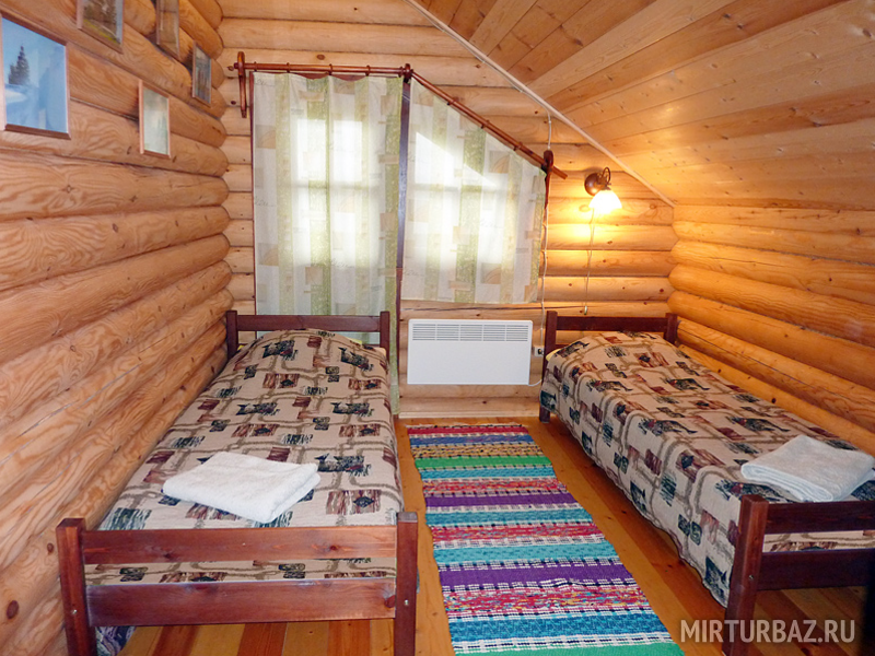 На втором этаже располагаются две комнаты на 4 места с односпальными кроватями, которые при желании мы объединяем в большие двуспальные, отапливаются комнаты конвекторами.
