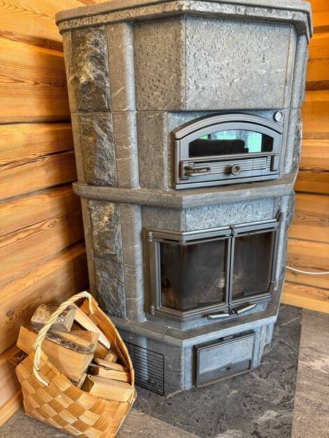 Большая гостиная с витражными окнами, дровяным камином Tulikiwi и мягкой ТВ-зоной для вашего отдыха.