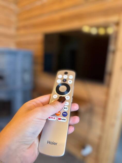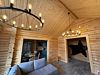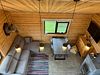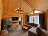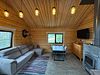 Большая гостиная с панорамными витражными окнами, дровяным камином Tulikiwi и мягкой ТВ-зоной для вашего отдыха.