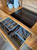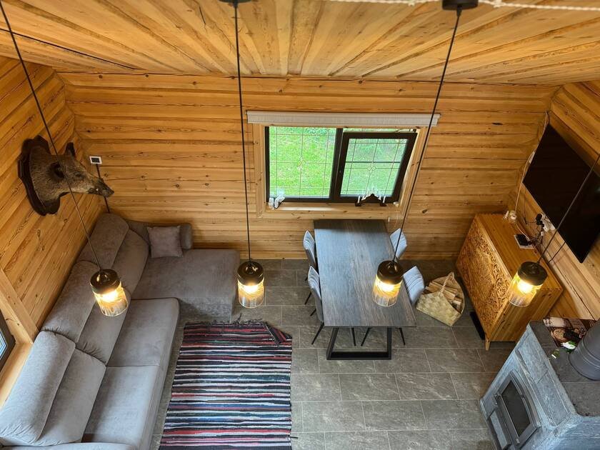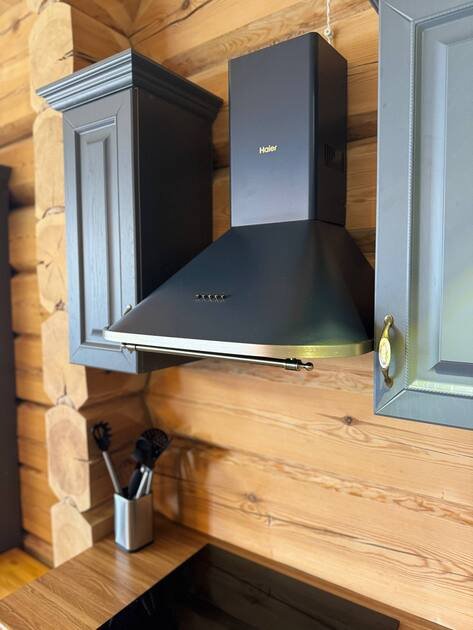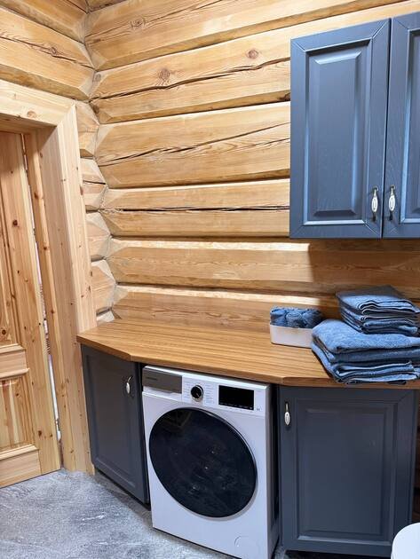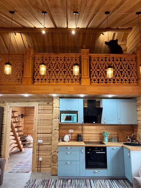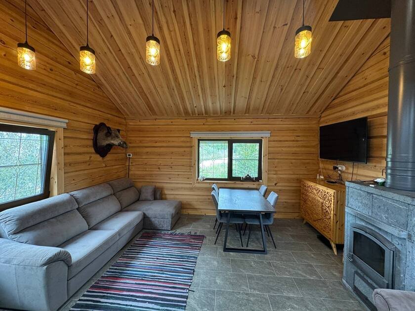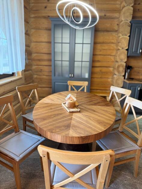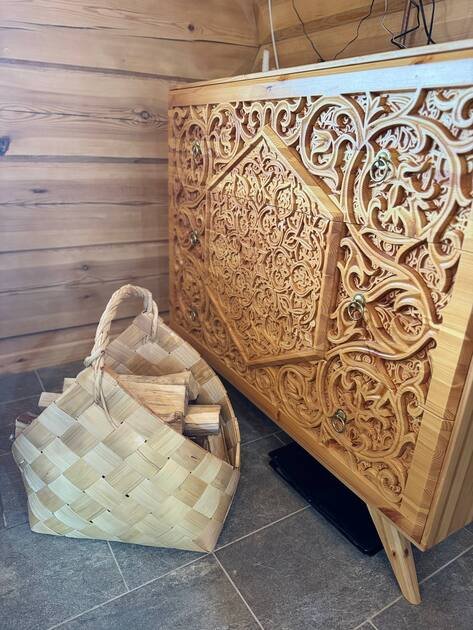 - сруб из лафета, камин из талькомагнезита, просторная финская сауна , дизайнерская мебель из массива и множество деталей ручной работы из натурального дерева.