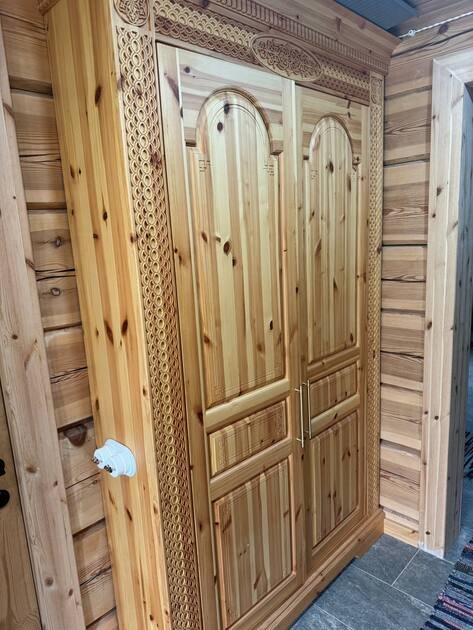 В доме много места для хранения: шкафы из массива дерева ручной работы в прихожей и вместительный комод в гостиной.