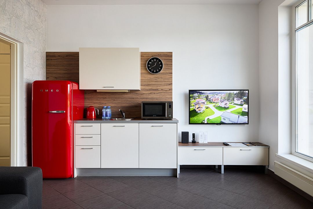 Кухня, санузел с душевой кабиной, зона отдыха, ТВ