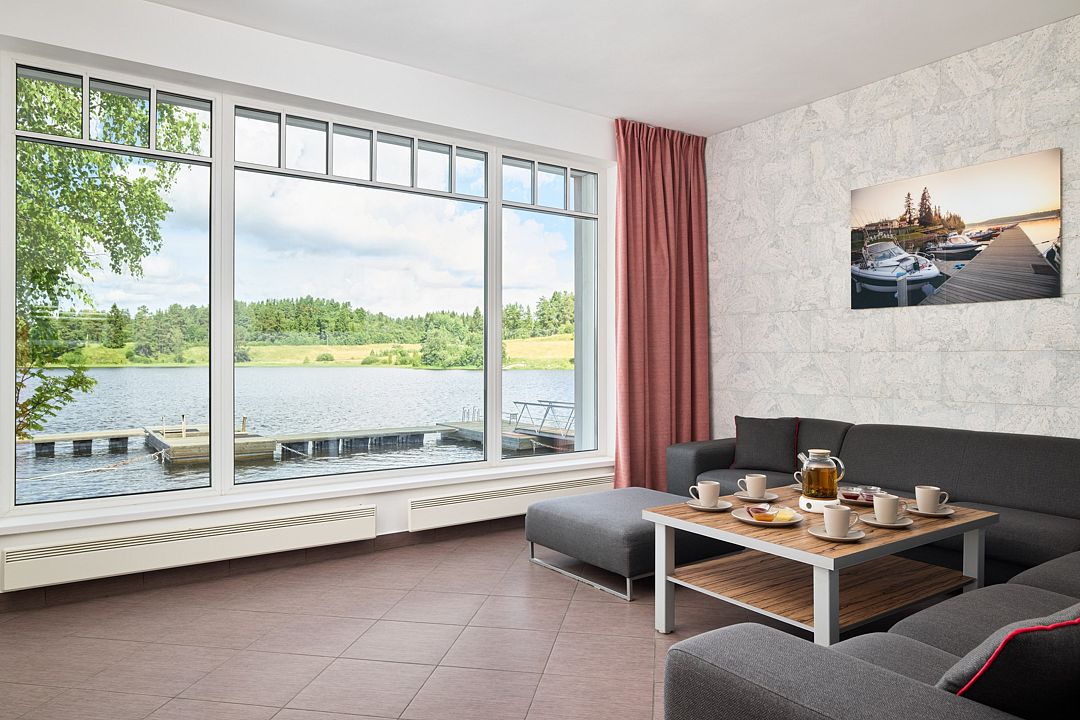 В центре благоустроенной территории гостиничного комплекса располагается административное здание, по периметру размещены двухэтажные коттеджи категории «Комфорт», коттеджи второй линии, а также таунхаусы и коттеджи с сауной на берегу залива.